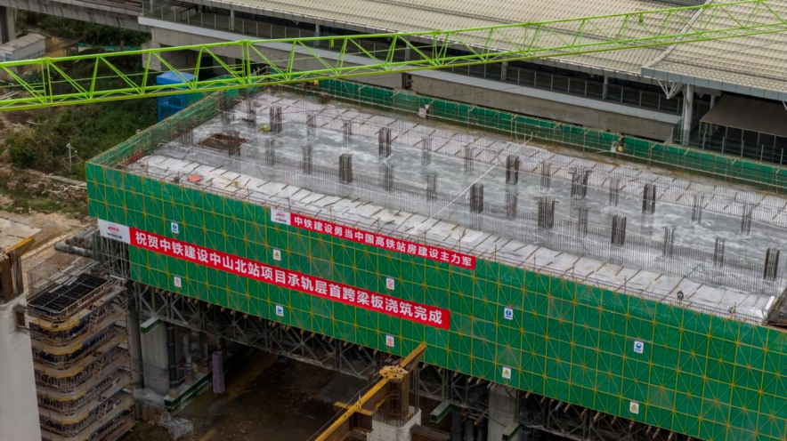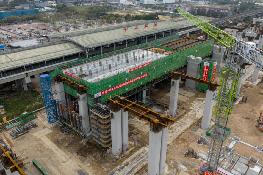 该承轨层长近230米、宽23米,是未来列车运行的核心平台。目前,中山北站施工建设已全面进入主体结构与钢结构施工“双线推进”阶段。