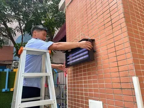科学消杀:44所学校均组建了校园消杀队,配备专业消杀器械及药剂,由街道专业消杀队定期对其进行培训。每周开展1-2次的重点区域专业消杀,配置和加设550余盏高效灭蚊灯,构建“动态消杀+静态防控”双重屏障,实现了消杀无死角。