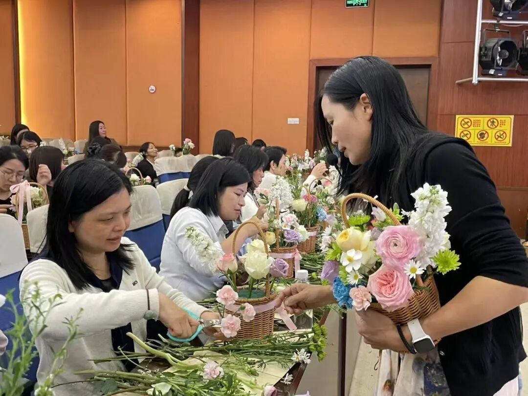 3月6日晚,西区街道90余名女职工在花香中度过了一个别样的节日夜晚。活动特邀花艺师围绕花材寓意、色彩美学、造型技法进行现场教学。在实践环节,大家充分发挥创意,将普通花枝修剪组合,化作一件件独具匠心的手提花篮。指尖流转间,工作的疲惫悄然消散,取而代之的是创作的喜悦与内心的充盈。