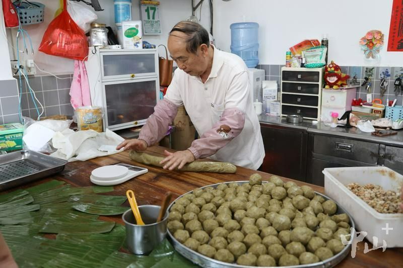 “圣狮孖仔记”,老手艺人在做栾樨饼。记者 王云 摄