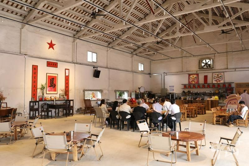 沙溪象角村人冯嘉锐和深圳过来的张志彬都是参与进来“会玩的人”。在旧粮仓另外3栋三角仓中,时尚的咖啡店、茶馆、文创店与传统古朴的博物馆呼应,给了年轻人时髦又怀旧的新选择。来来咖啡和即将开业的粥店是冯嘉锐的“玩法”,“乡村聚乐部”是张志彬的“玩法”,通过设计、文创和线下活动,他们都在新业态中加入了浓浓的圣狮文化元素。