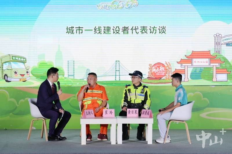 重头戏“城市文明大家谈”环节随即到来。活动邀请中山投控环境科技有限公司机械保洁班班长崔玲、交警城区大队石岐街道二中队辅警班长黄日果、第十五届全运会“小海豚”志愿者招勇成三位来自不同领域的城市建设者做客现场,分享自己的“城市建设故事”。