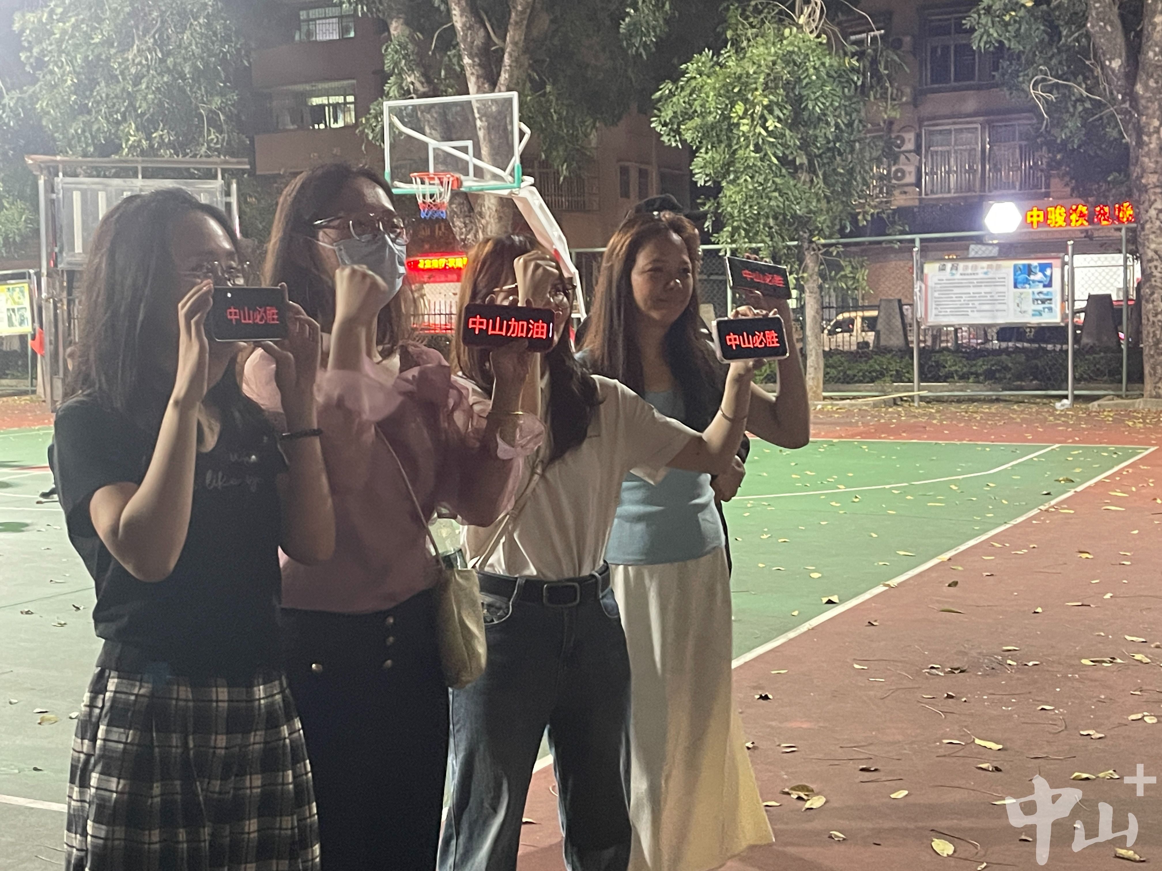 一下班,市民刘女士便和同事赶来篮球场,一同为中山队加油。她们手持手机,屏幕亮起,红色LED文字滚动显示着“中山必胜”“中山加油”。