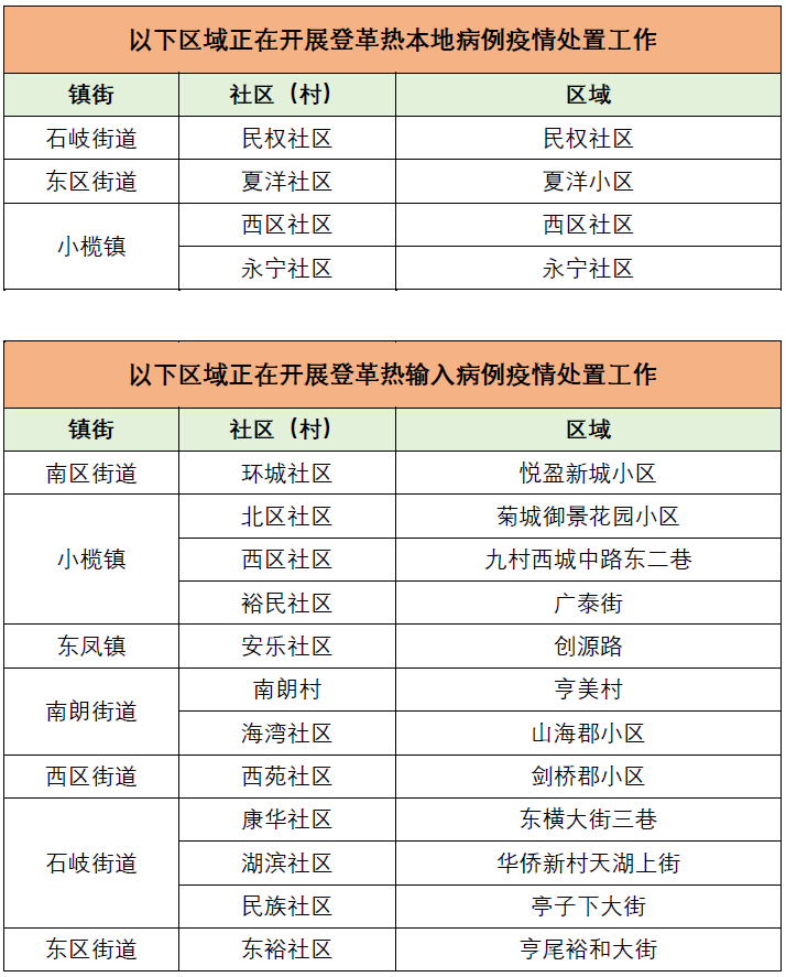 中山市疾控中心提醒,中山市以下区域正在开展登革热疫情处置: