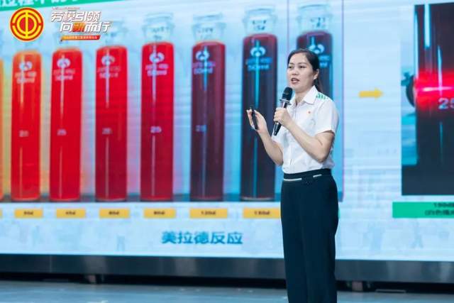一场别开生面的“辨味识酱油”互动拉开第二场宣讲的帷幕:同学们可以通过看、闻、尝以及互相讨论的方式辨别选出对应的酱油,而符姜燕只能凭嗅觉来进行PK,“这份才是正确答案。”精准的判断赢得全场连连掌声!当大屏幕展示现代化酱油生产线时,她深情地说道:“就像培育菌种一样,既要有久久为功的匠心沉淀,更要在传承中激活创新的基因密码。”从传统酿造到现代创新,符姜燕用汗水与坚守书写着与国家制造紧密相连的“酱油人生”。