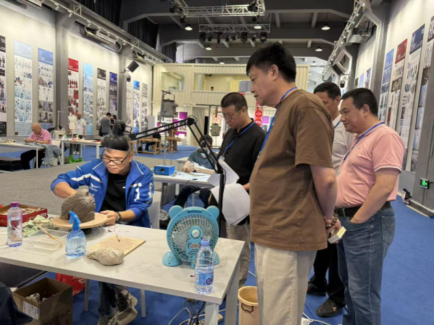 广东省工艺美术大师、雕塑专业评委陈志忠则聚焦“实操流程把控”与“材料处理”两个维度:“有位雕塑选手用陶泥创作‘邻里和睦’主题作品,从材料切割到细节刻画,每一步都按流程推进,没有浪费石材,还最大化展现了石材的自然纹理,这就是‘材料适配性’和‘流程把控度’的优秀案例。” 他提到,评审不仅看 “手艺好不好”,更看 “思路清不清晰”,“能把‘和谐’主题融入工艺细节,又兼顾实操效率,才是真正符合‘大师’标准的从业者。”