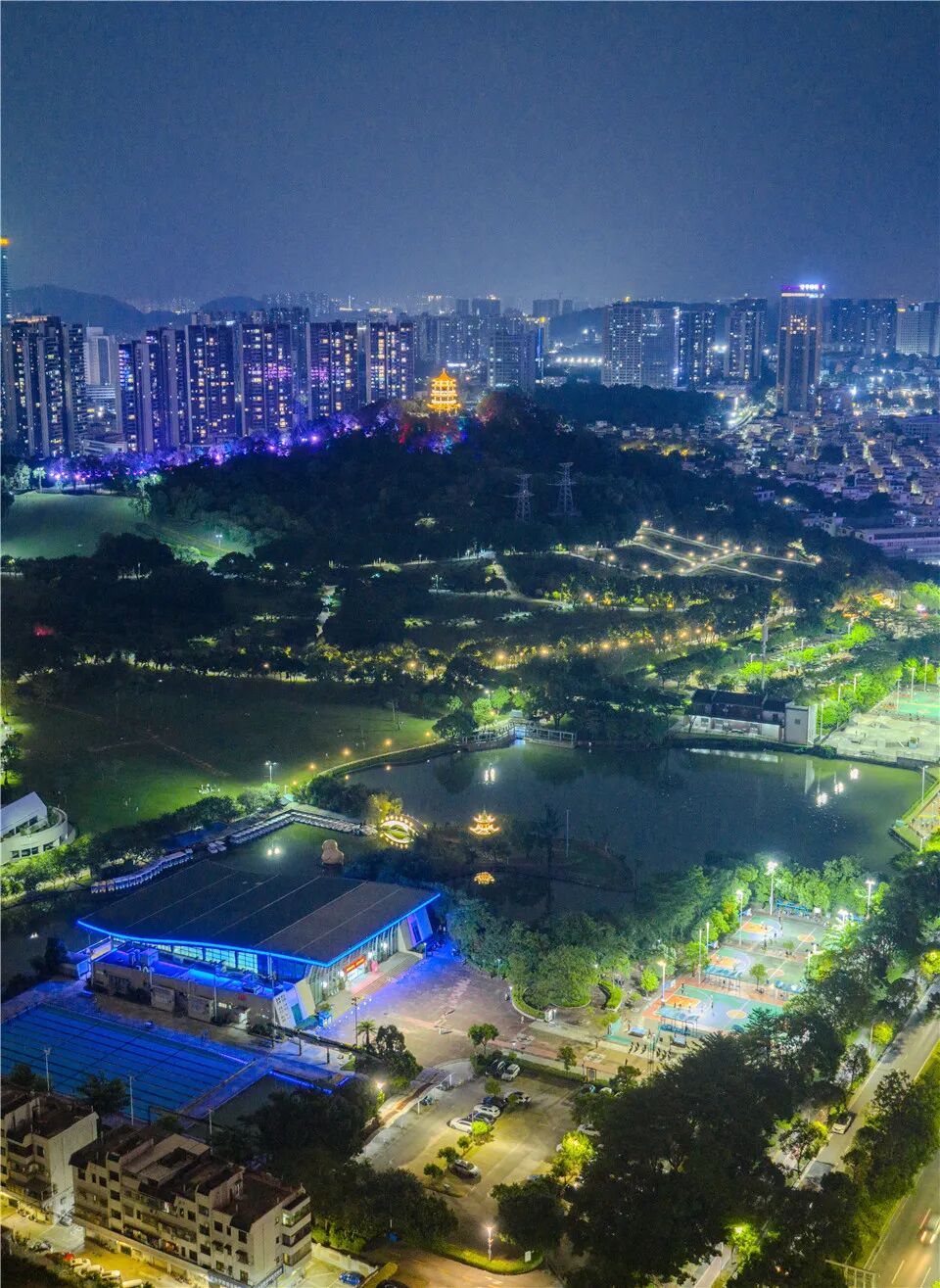 聚焦东区紫马岭公园,展现绿地灯光秀与市民休憩场景,直观呈现休闲氛围。
