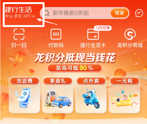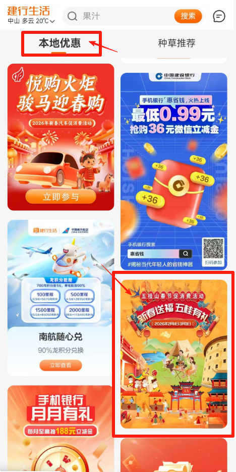 2.进入入口:打开“建行生活”APP,定位选择“中山市”,下拉在“本地优惠”中找到“新春送福·五桂有礼”五桂山春节促消费活动入口,进入活动专题页面;