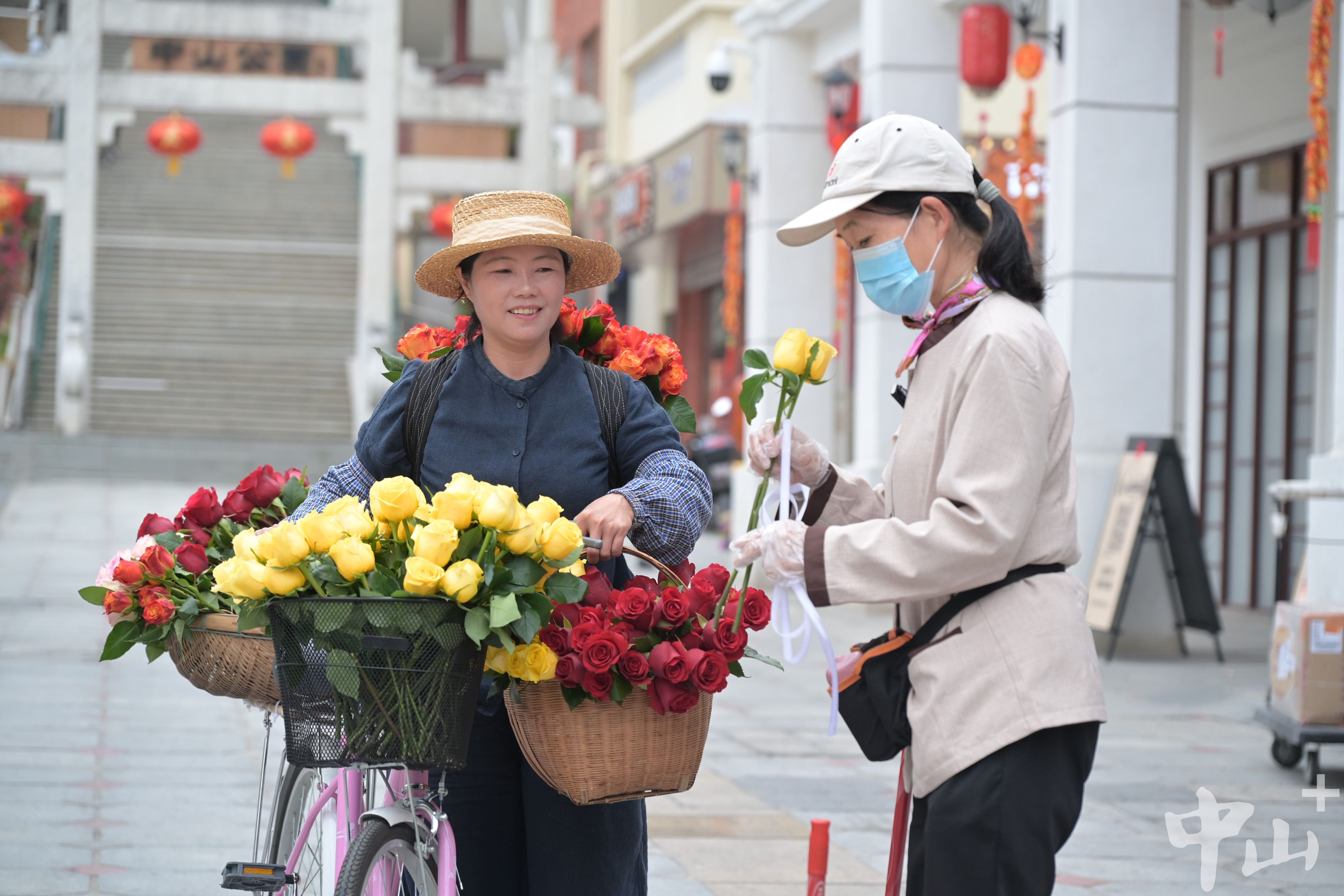 月光一边沿街前行,一边双手捧起玫瑰花轻轻递向路人。环卫工人肖姨接过花,还没来得及摘去口罩,便把花凑近鼻尖嗅一嗅:“我在这里工作好多年了,第一次收到玫瑰花,今年过年值班心里也会暖暖的!”同样收到鲜花的还有游客黄女士两姐妹。“我们两姐妹一个从香港过来,一个从加拿大回来,今天在中山遇见‘荷花姑娘’送花,真是意外之喜!”黄女士两姐妹手捧刚收到的玫瑰,以身后南洋风情的骑楼为背景合影留念。她们表示,趁着家人从国外回来的机会,特意抽空到中山逛逛,感受下中山的美食以及岭南的年味。