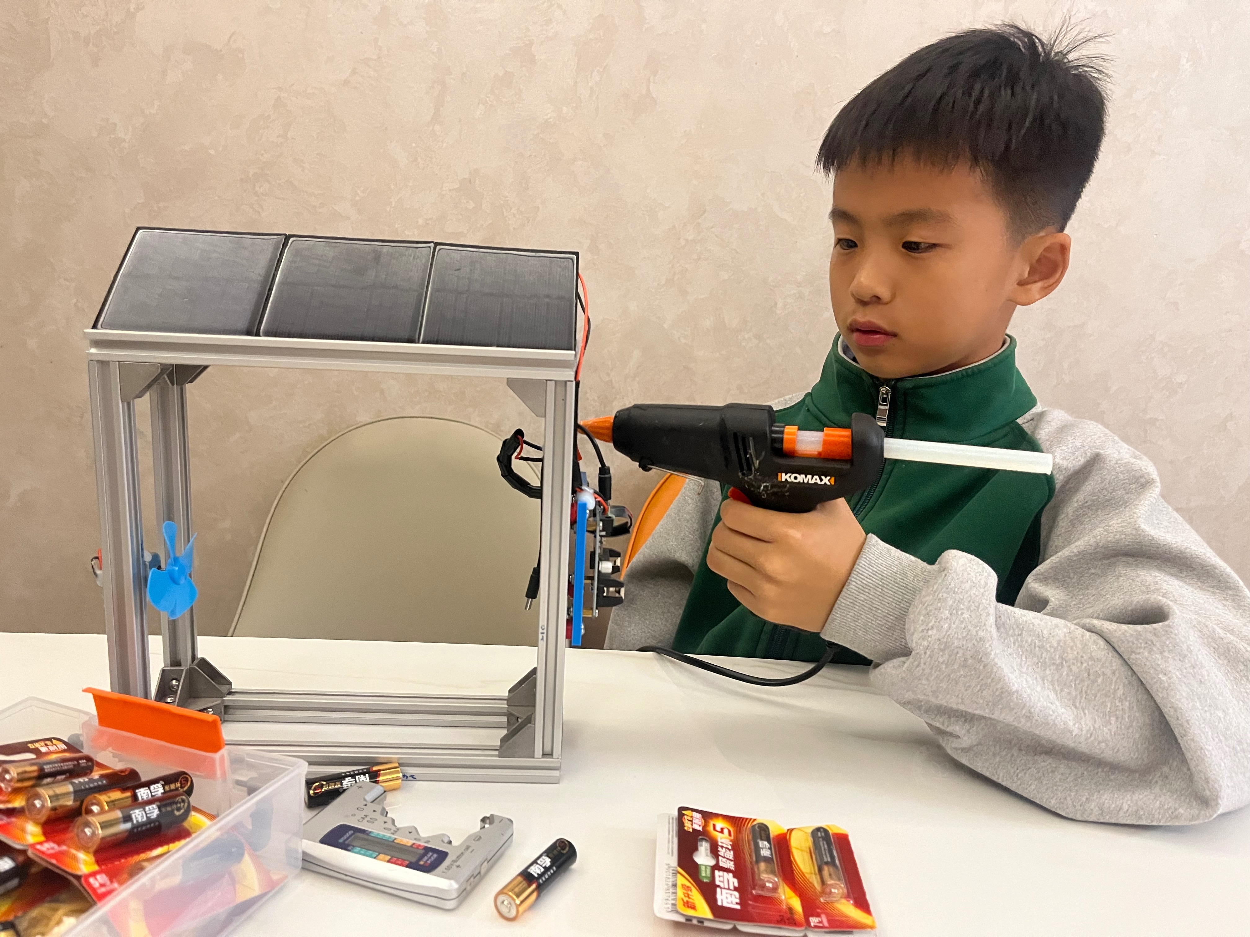 接下来,我们分工合作,哥哥设计型材尺寸,爸爸帮忙切割加工,我负责搭建框架,之后用胶枪把太阳能板固定在框架顶部,小风扇装在左侧,再用铜芯线将太阳能电源管理模块、风扇和太阳能板一一连接。发明原理很简单:太阳能板吸收阳光转化为电能,经电源管理模块稳定输出,带动风扇加速空气流动,让湿衣服快点驱走潮气!