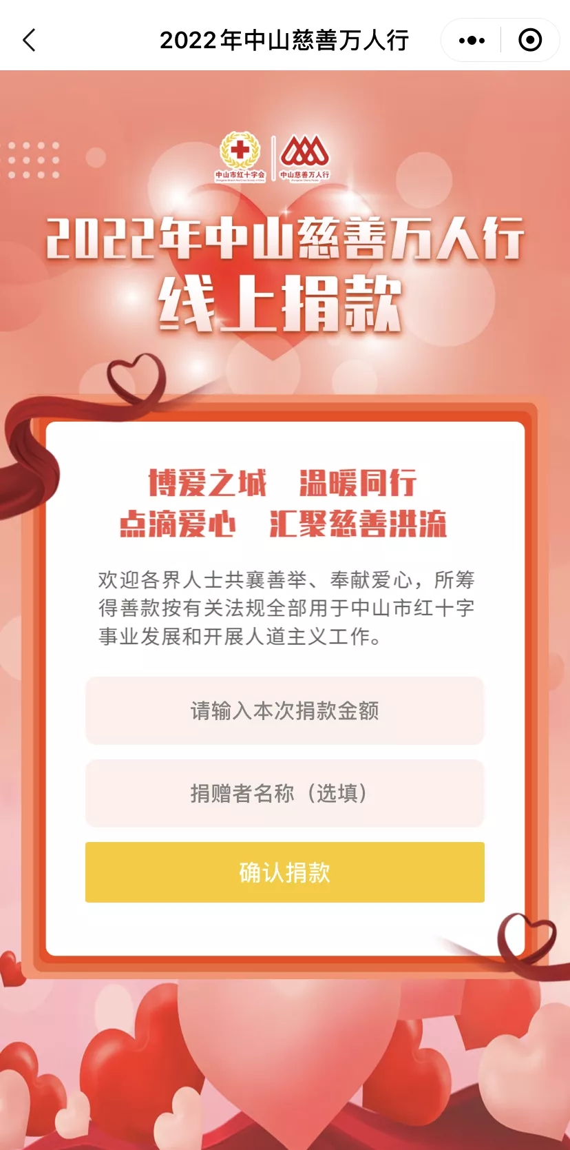 积小善,成大爱,快邀请身边的亲朋、好友、同事一同参与为中山慈善事业贡献一份自己的力量。