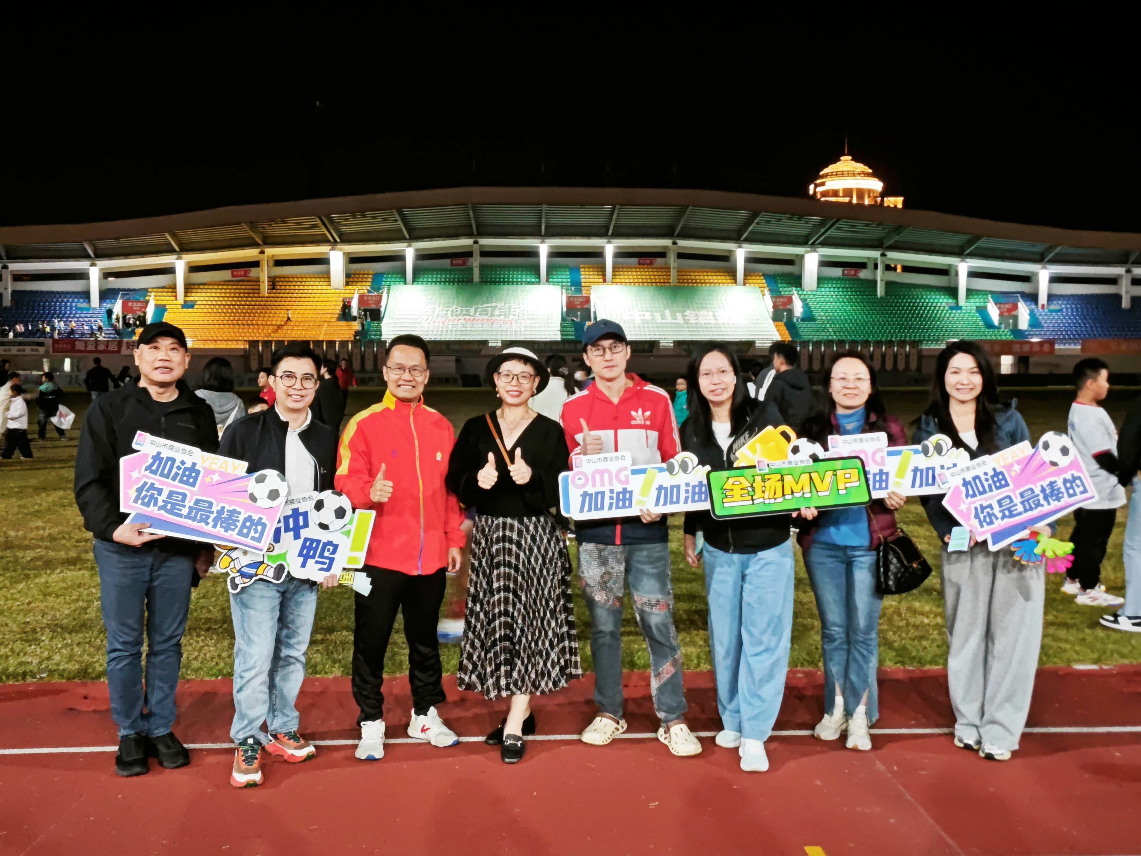 当晚19时30分,随着主裁判一声哨响,比赛正式拉开帷幕。石岐香山古城队作为主场作战的队伍,一开场便展现出极强的进攻欲望,精准的传球、迅猛的突破频频威胁对方球门。看台上,中山市商业协会观赛团的助威声此起彼伏,“石岐加油!”的口号整齐划一,与现场球迷的欢呼声交织成一片欢乐的海洋。观赛团成员们挥舞着印有“中山市商业协会”的旗帜和手牌,每一次球队发起进攻、每一次门将精彩扑救,都能引发他们热烈的掌声与喝彩。