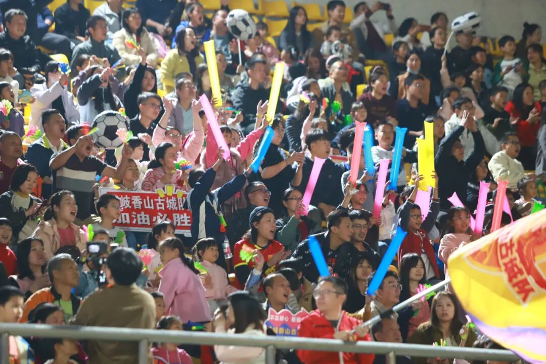 赛场之上,石岐香山古城队的表现没有辜负现场观众的期待。上半场第23分钟,球队前锋抓住对方防守漏洞,一脚劲射破门,将比分改写为1比0。观赛团瞬间沸腾,成员们高举助威棒欢呼跳跃,现场气氛被推向第一个高潮。随后的比赛中,石岐香山古城队稳扎稳打,凭借默契的团队配合与技战术水平,先后在第38分钟和下半场第65分钟再入两球,最终以3比0的悬殊比分完胜南头智造队,用一场酣畅淋漓的胜利回报了现场球迷的支持。