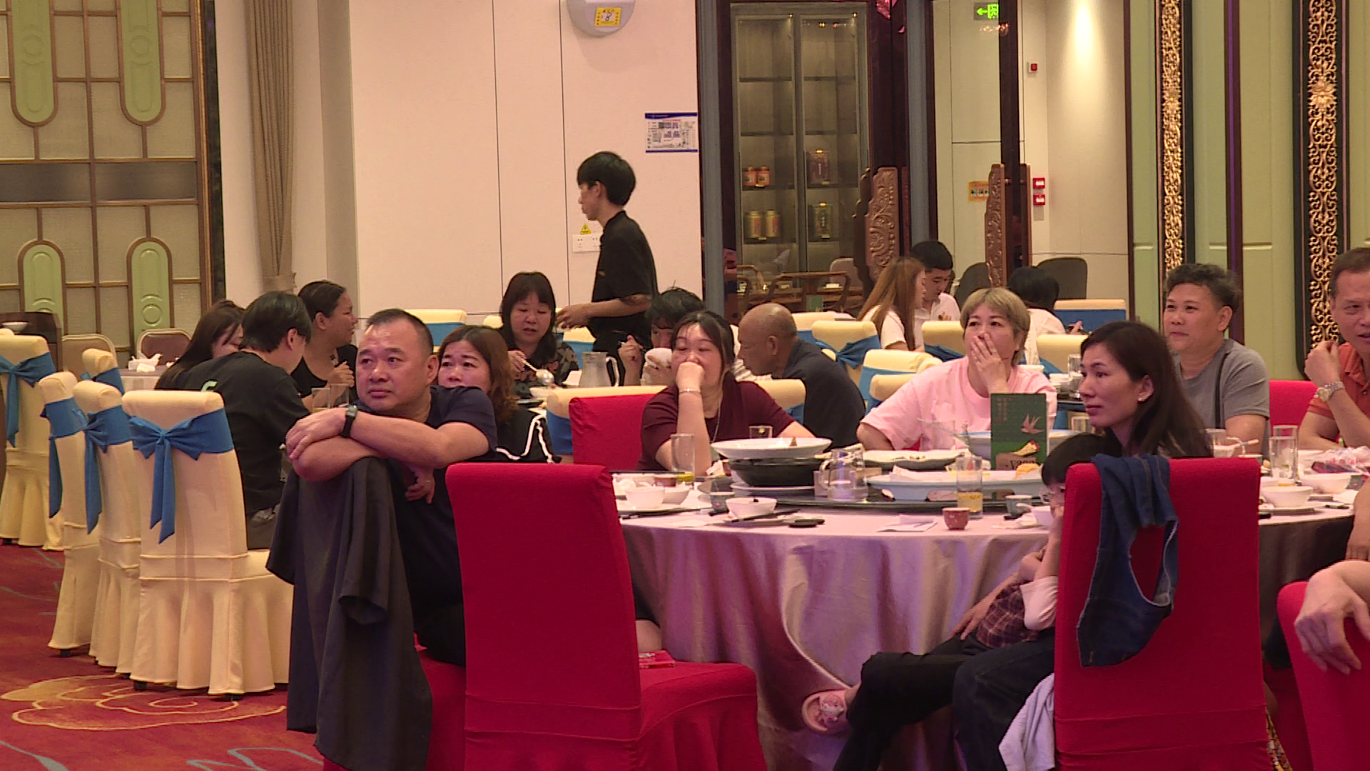 当晚7时30分,直播赛事的两家酒楼大堂内已是人头攒动,大堂正前方的巨幅屏幕播放着比赛画面,球迷们三五成群,围坐在一起,桌上摆满了充满中山特色的美味佳肴。