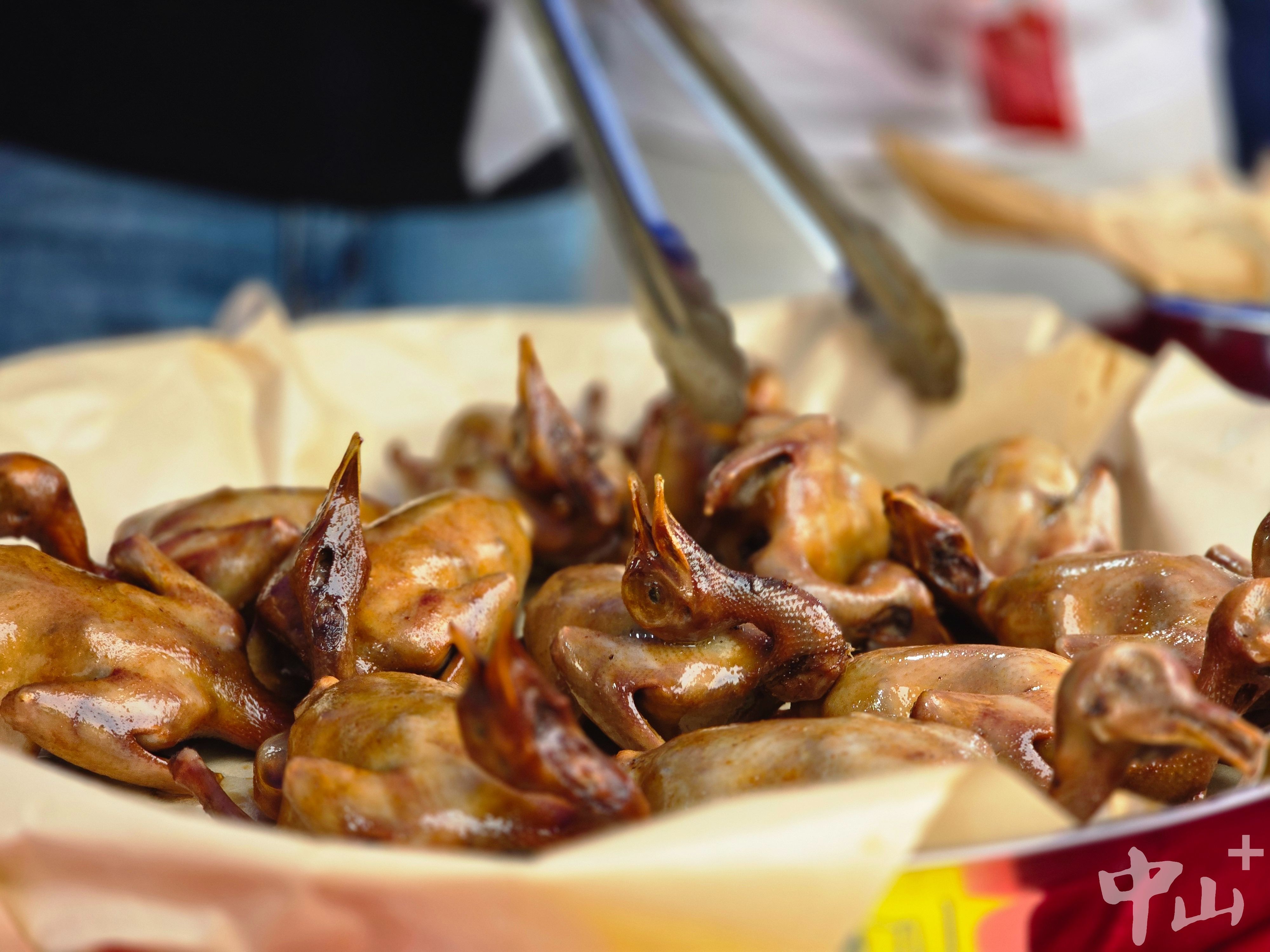来自阳江的球迷陈先生正在与家人分享新鲜出锅的石岐乳鸽。他表示,此前已多次到访中山,这次是专程来观看比赛的。“一来到就觉得好香,刚刚已经吃了美食,比如鲮鱼饼。现在试试乳鸽,正宗的乳鸽咬下去是爆汁的,非常好吃。”对本次比赛十分期待的陈先生直言,“食到饱晒!”