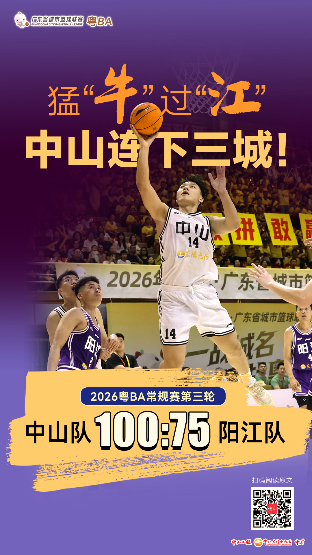 4月11日晚,2026年粤BA第三轮常规赛打响,中山队在中山体育馆主场迎战阳江队。最终,中山队以100:75的比分战胜阳江队,斩获“三连胜”!