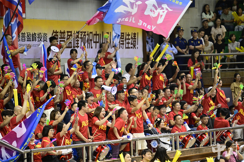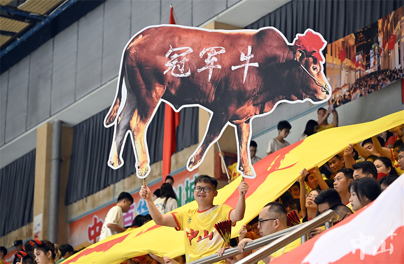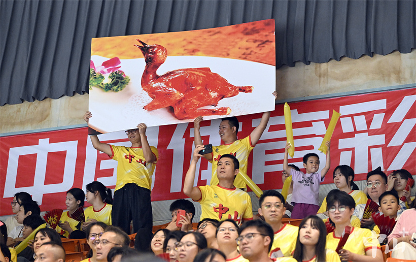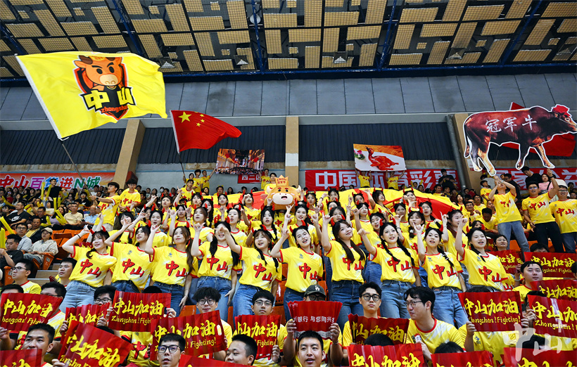 ▲中山拉拉队高举横幅标语,手持助威道具为队员加油鼓劲。