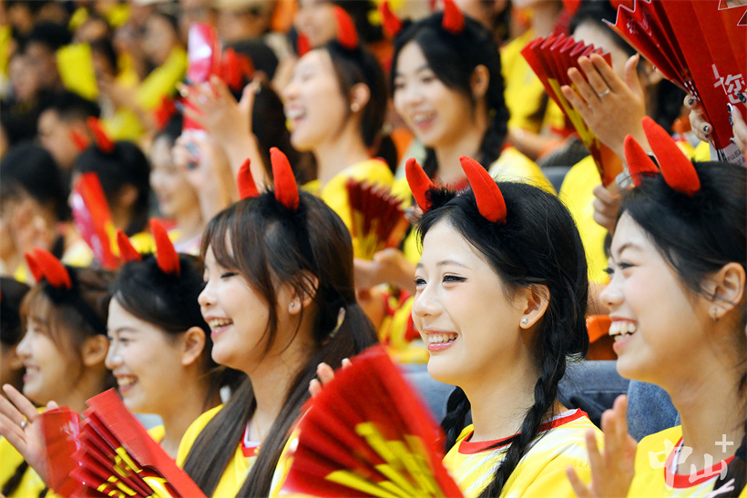 ▲电子科技大学中山学院健美操、拉拉操队员们头戴牛角,为中山队加油。