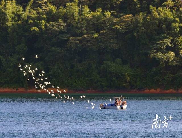 广州从化,鸟儿伴飞游船。