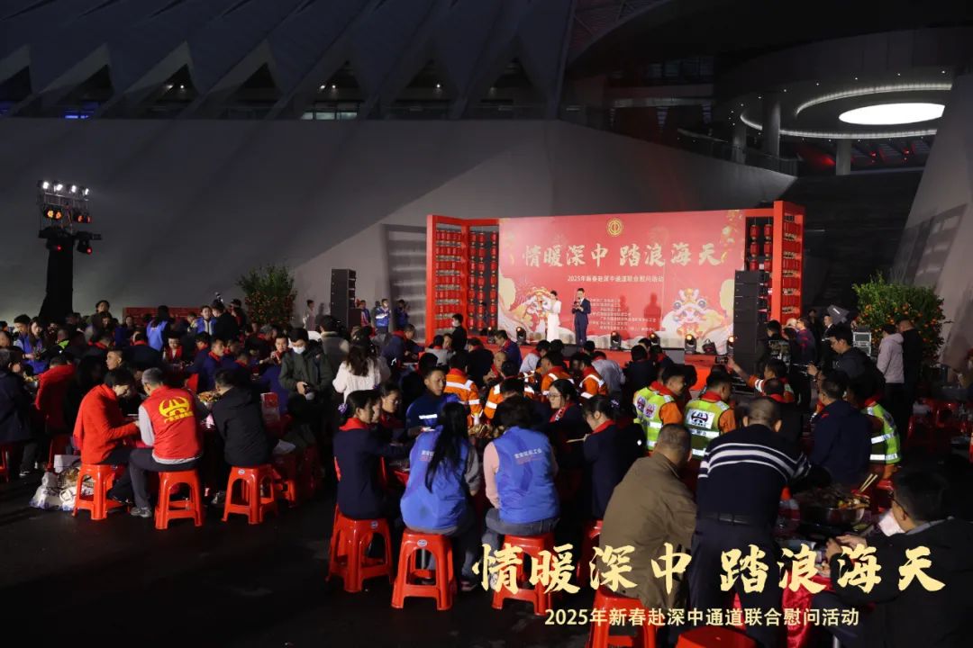 1月23日,由广东省总工会携手深圳、中山两地工会举办的“情暖深中·踏浪海天”2025年新春赴深中通道联合慰问活动在深中通道西人工岛顺利举行。活动通过暖心慰问、新春游园、共进年夜饭、演出晚会等形式,向深中通道管理中心工作人员、深中通道项目建设者送上“娘家人”的关怀和新年祝福,提前感受到浓浓的年味。