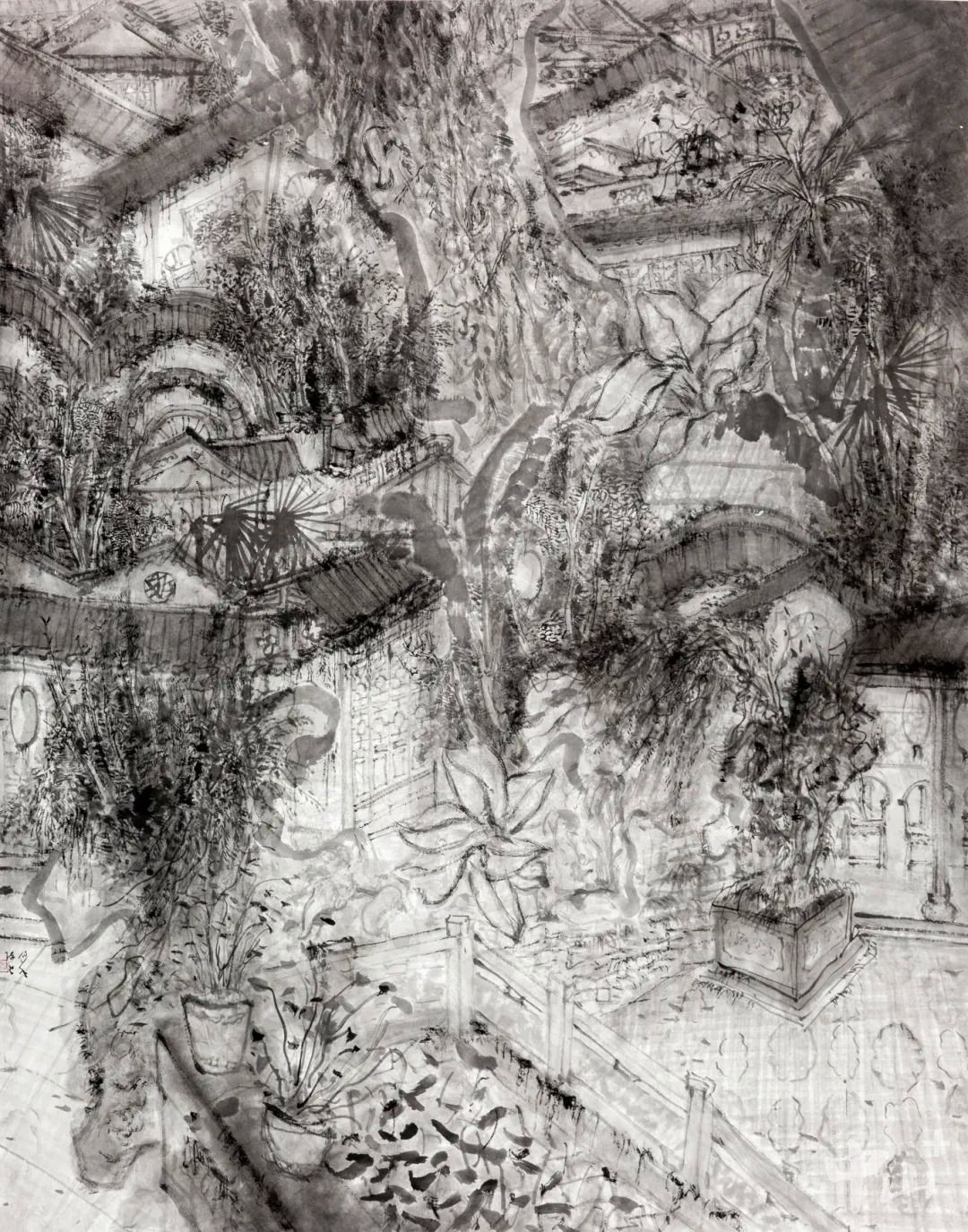陈云的《写意岭南》以200×160厘米的宏幅,勾勒出岭南园林的独特韵味。为捕捉创作灵感,他多次深入清晖园、可园、詹园等岭南名园实地写生,将亭台楼阁、曲径通幽的实景精准转化为艺术素材。“传统笔墨不应困于古意,而要承载当代温度”,基于这一核心创作理念,他在作品中强调以书入画的书写性,将凝练的笔墨语言与当代艺术形式深度融合,让岭南园林的人文底蕴在笔墨流转中焕发契合当代审美的新生。作为中国国家画院访问学者、中国书法家协会会员,陈云多年来深耕书画艺术,其作品被多家权威机构收藏,此次创作更是他扎根本土文化、探索传统艺术当代转化的心血之作。
