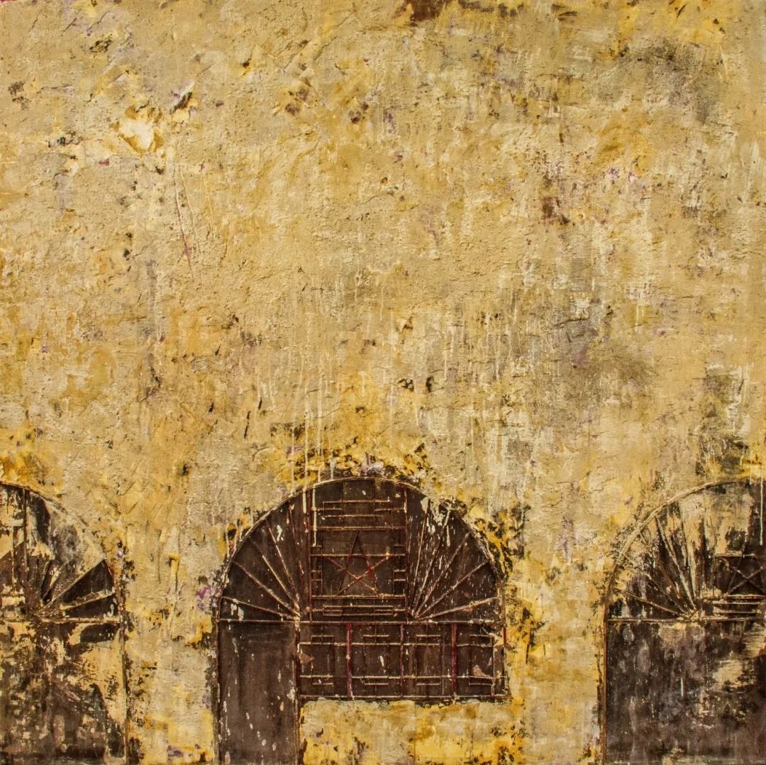 肖力强的《不朽的丰碑——延安窑洞》则以190×190厘米的综合材料作品,定格革命历史的精神坐标。在他看来,黄土高原的窑洞不仅是古老的居住形式,更沉积着深厚的文化底蕴与珍贵的革命记忆——正是在简陋昏暗的窑洞里,革命先辈克服重重困难,拨开了笼罩在国人头上的阴云,探索出中国革命胜利的光明之路。创作中,他任凭心中涌动的崇敬之情通过画笔、刮刀在画布上自由挥洒,刀痕与笔迹交错纵横,从构图布局到色彩晕染,从色层衔接到笔触变化,都赋予作品古典静穆的质感与极致唯美的诗意。身为广东省美协综合材料绘画与美术作品保存修复艺委会中山研创基地副主任,肖力强深耕综合材料领域多年,作品曾多次入选国家级、省级展览,此次创作是他以创新艺术语言传承红色基因的重要实践。