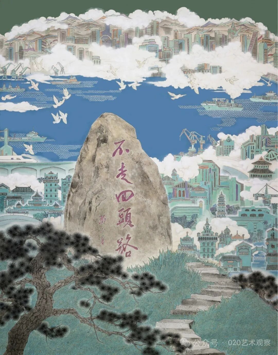 “艺术家应当与时代同行,为时代立像。”这是肖伟的创作信念。他的作品立足时代与本土,实现主题创作与人文传承深度融合。重彩壁画《不走回头路》以纪念碑式的艺术语言,定格改革开放敢闯敢试的时代精神;《深中桥影绘宏图》聚焦深中通道工程,描绘湾区融合发展的壮阔图景。同时,他深耕岭南与中山文化底蕴,刻画孙中山等本土历史名人,让地域文化根脉在笔墨中传承。