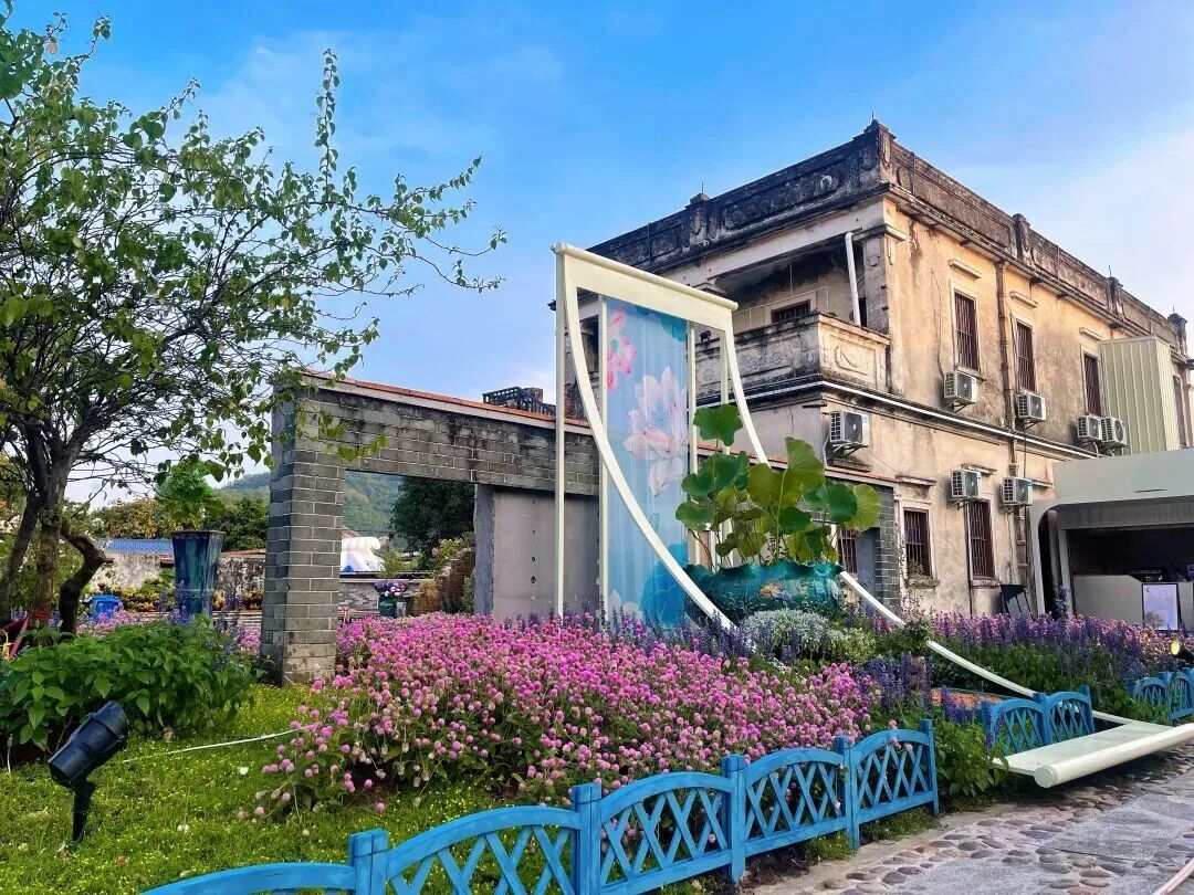 路旁鲜花漾开蓝粉云海