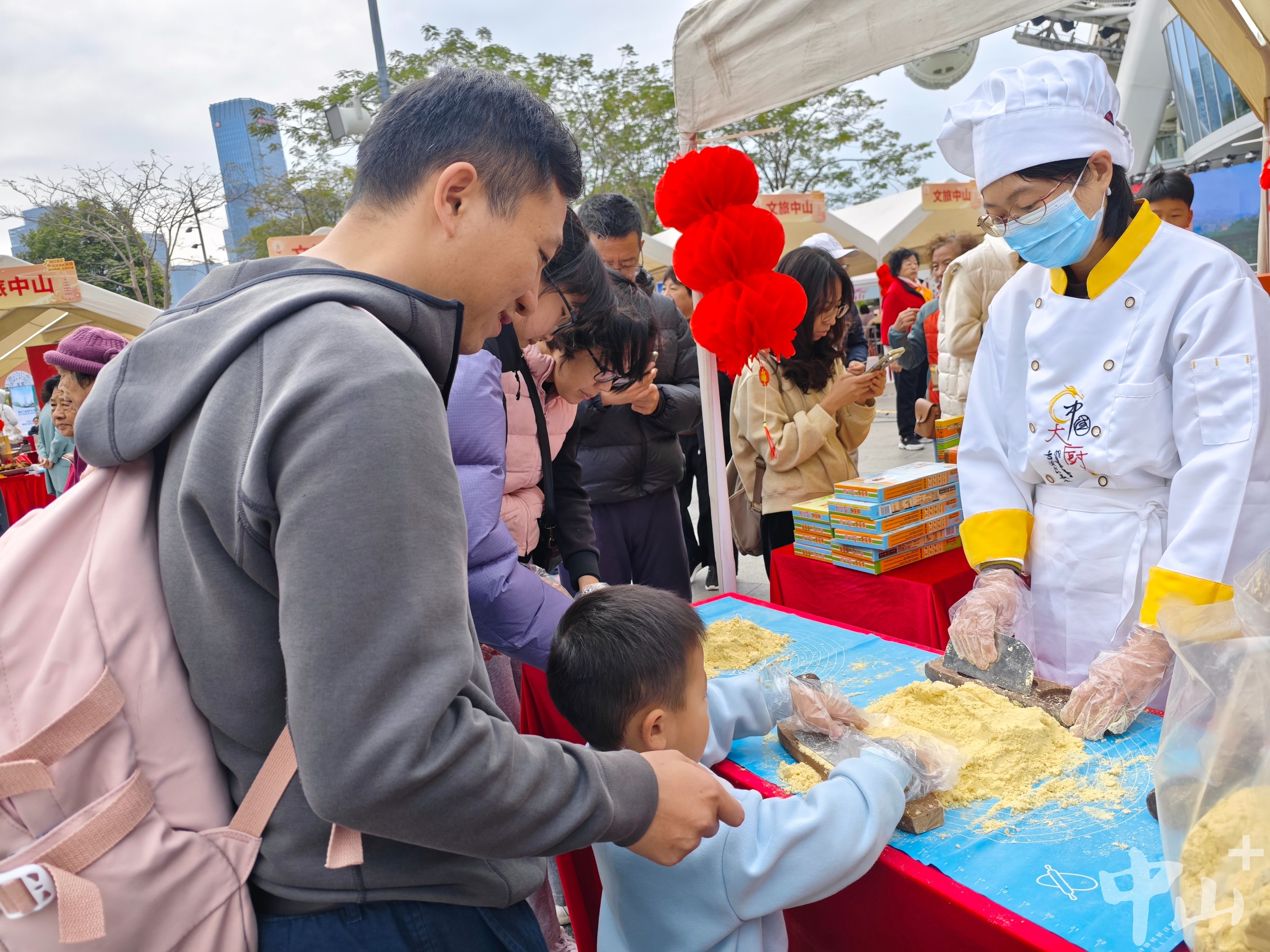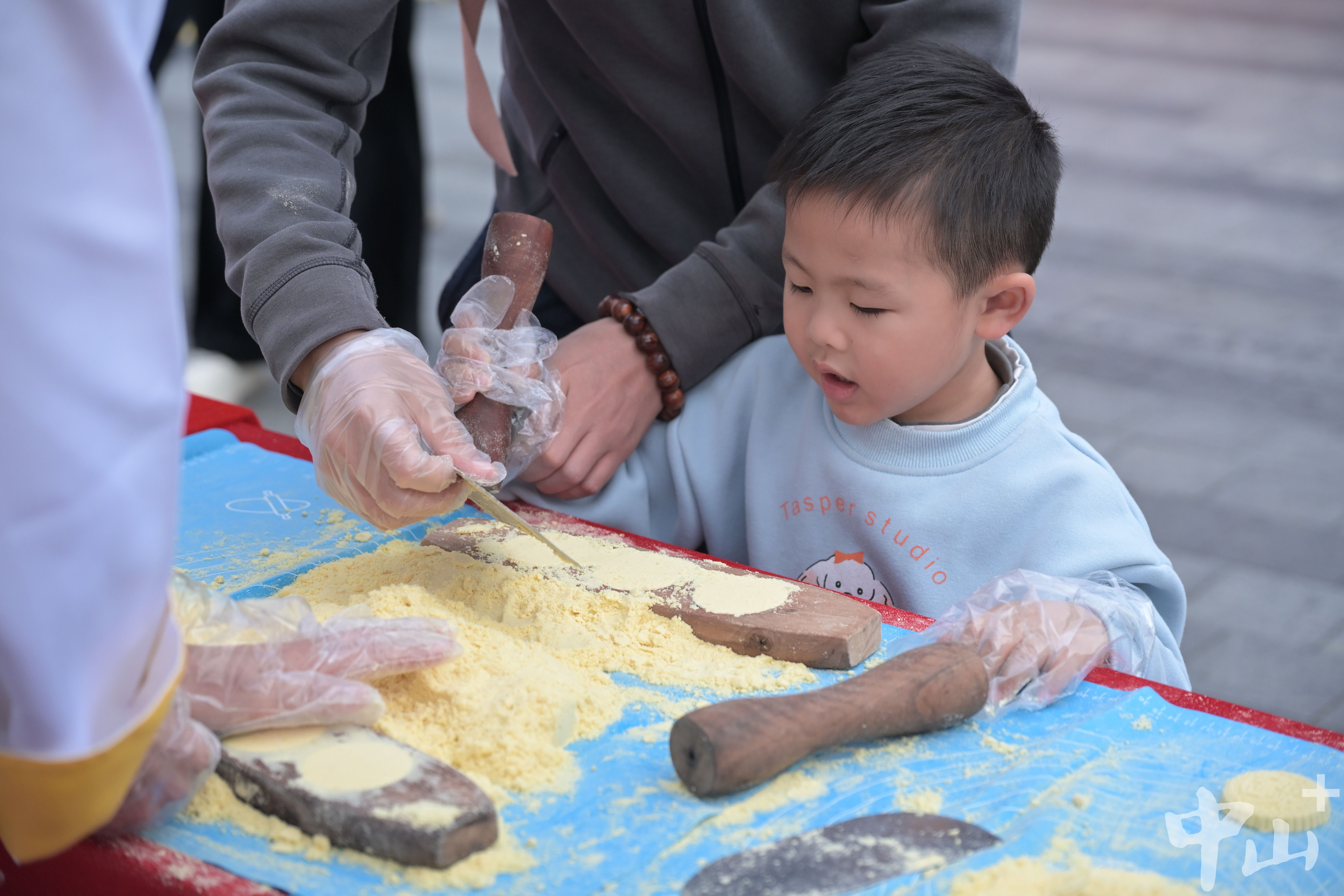 在咀香园展位前,深圳市民彭先生正带着孩子体验手工制作杏仁饼。孩子的小手将饼模压实,再轻轻一磕,一枚带有“咀香园”字样的杏仁饼便落在掌心。“好玩!”孩子兴奋地直呼。彭先生表示,自己是从微信公众号看到活动信息后特意赶来的,想让孩子在“家门口”近距离感受中山文化。亲手制作杏仁饼的过程,也让他对这款中山老字号有了更深的感触:“以前都是直接买成品,这次自己动手,才体会到背后的匠心。”