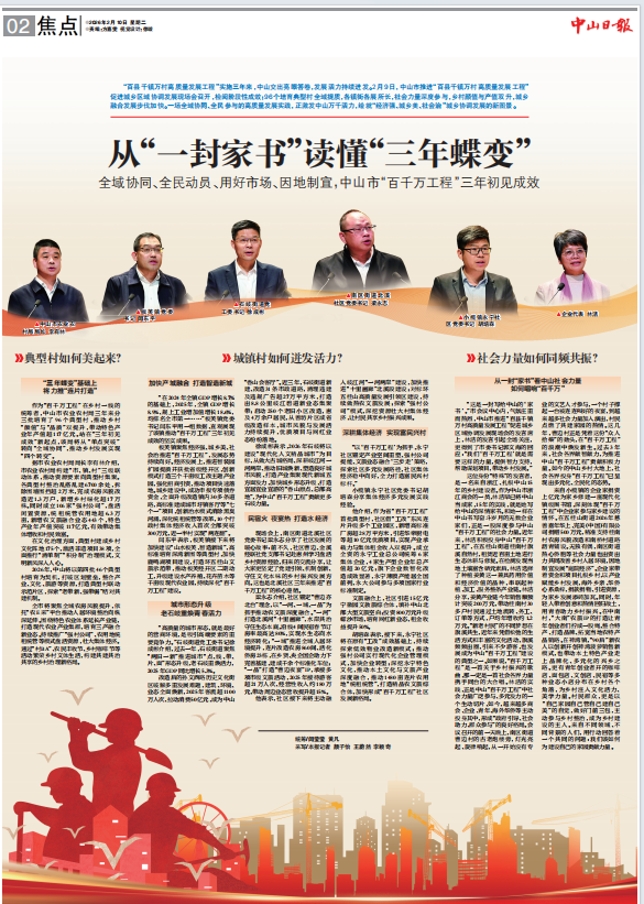 “百县千镇万村高质量发展工程”实施三年来,中山交出亮眼答卷,发展活力持续迸发。2月9日,中山市推进“百县千镇万村高质量发展工程”促进城乡区域协调发展现场会召开,检阅阶段性成效:96个培育典型村全域提质,各镇街各展所长,社会力量深度参与,乡村颜值与产值双升,城乡融合发展步伐加快。一场全域协同、全民参与的高质量发展实践,正激发中山万千活力,绘就“经济强、城乡美、社会治”城乡协调发展的新图景。