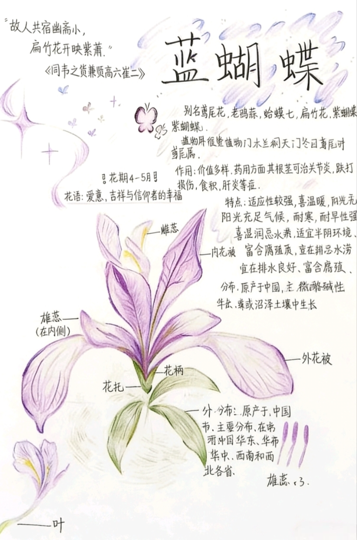 这份蓝蝴蝶(鸢尾花)生物手抄报,灵感源于在中山城区公园里的实地观察,内容详实、图文并茂,精准还原了植物形态与结构。作品涵盖别名、科属、花期、药用价值等知识点,与画面相得益彰,既展现了细致的观察能力,又体现了扎实的知识储备。