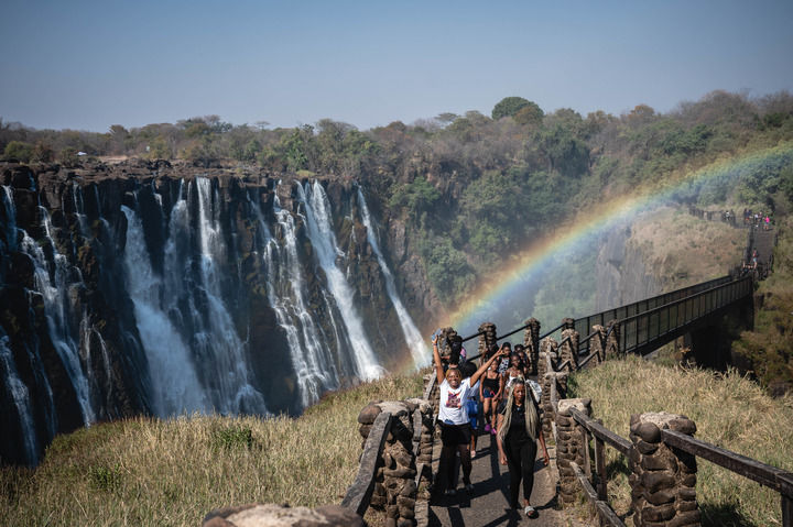 8月21日,游客在赞比亚观赏维多利亚瀑布景色。