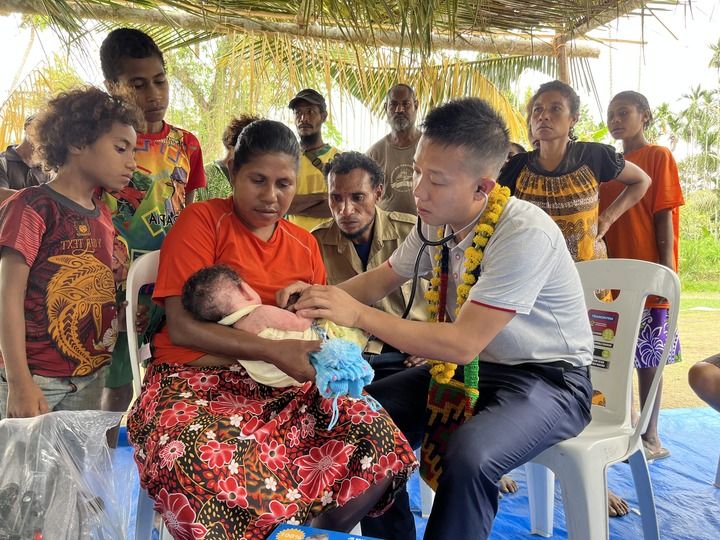 2023年8月5日,在巴布亚新几内亚中央省的一个村庄里,第12批援巴新中国医疗队副队长、新生儿科副主任医师刘振球为当地婴儿听诊检查。新华社发(第12批援巴新中国医疗队供图)