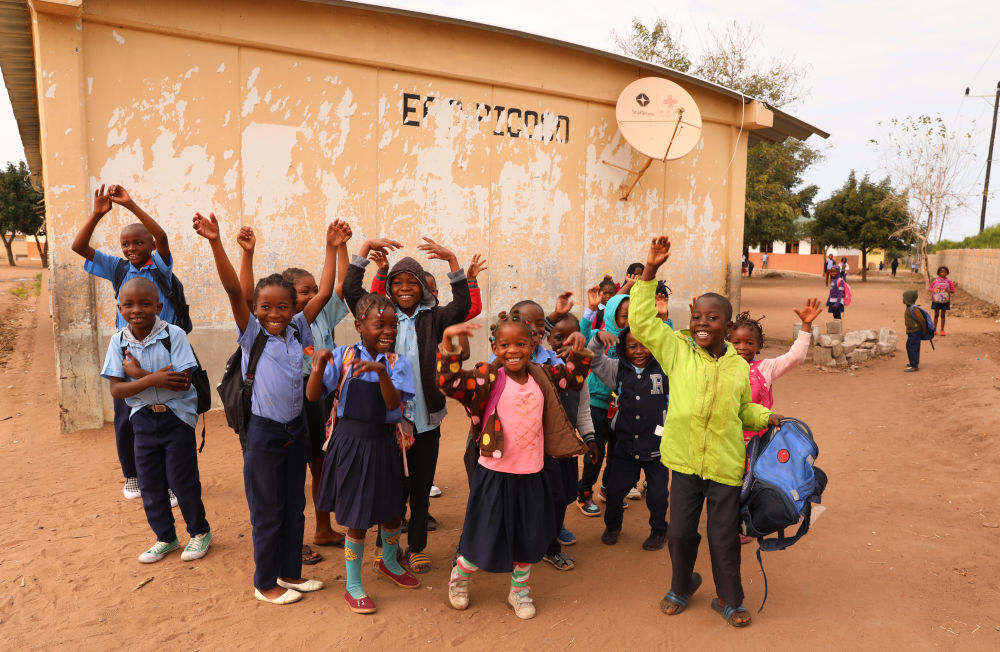 2023年7月25日,莫桑比克马普托省皮科科村学校的孩子们站在装有中国援助的卫星电视接收天线的房屋前。新华社记者 董江辉 摄