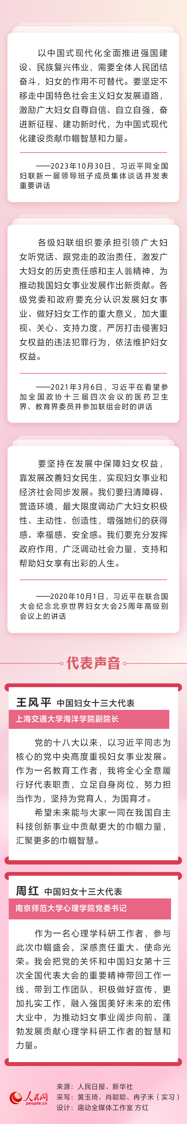党的十八大以来,以习近平同志为核心的党中央从党和国家事业发展全局出发,高度重视和积极推进妇女工作,加强党对妇女工作的领导,坚持中国特色社会主义妇女发展道路,部署妇联改革任务,发挥妇女在各个方面的积极作用,推动我国妇女事业取得历史性成就。人民网带您重温习近平总书记重要论述并邀请中国妇女十三大代表解读。