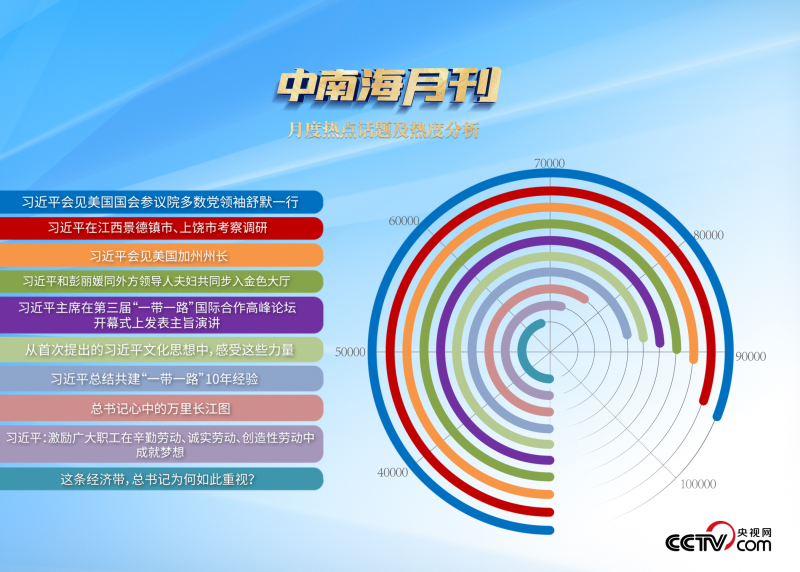 央视网“智闻”系统提取分析10月全网时政新闻热点显示,“习近平主席会见美国国会参议院多数党领袖舒默一行”“习近平会见美国加州州长”“习近平主持召开进一步推动长江经济带高质量发展座谈会”等话题最受网民关注。