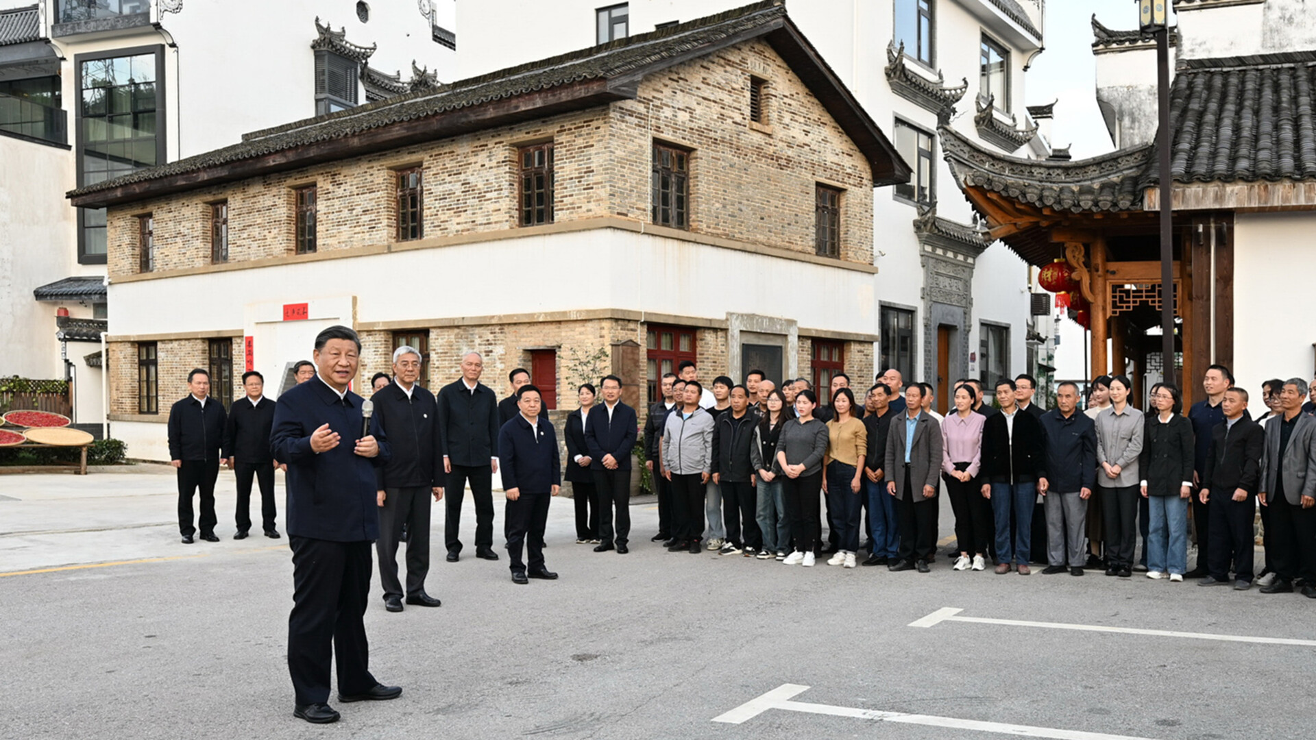 10月11日,习近平总书记在上饶市婺源县秋口镇王村石门自然村考察时,同村民们亲切交流。