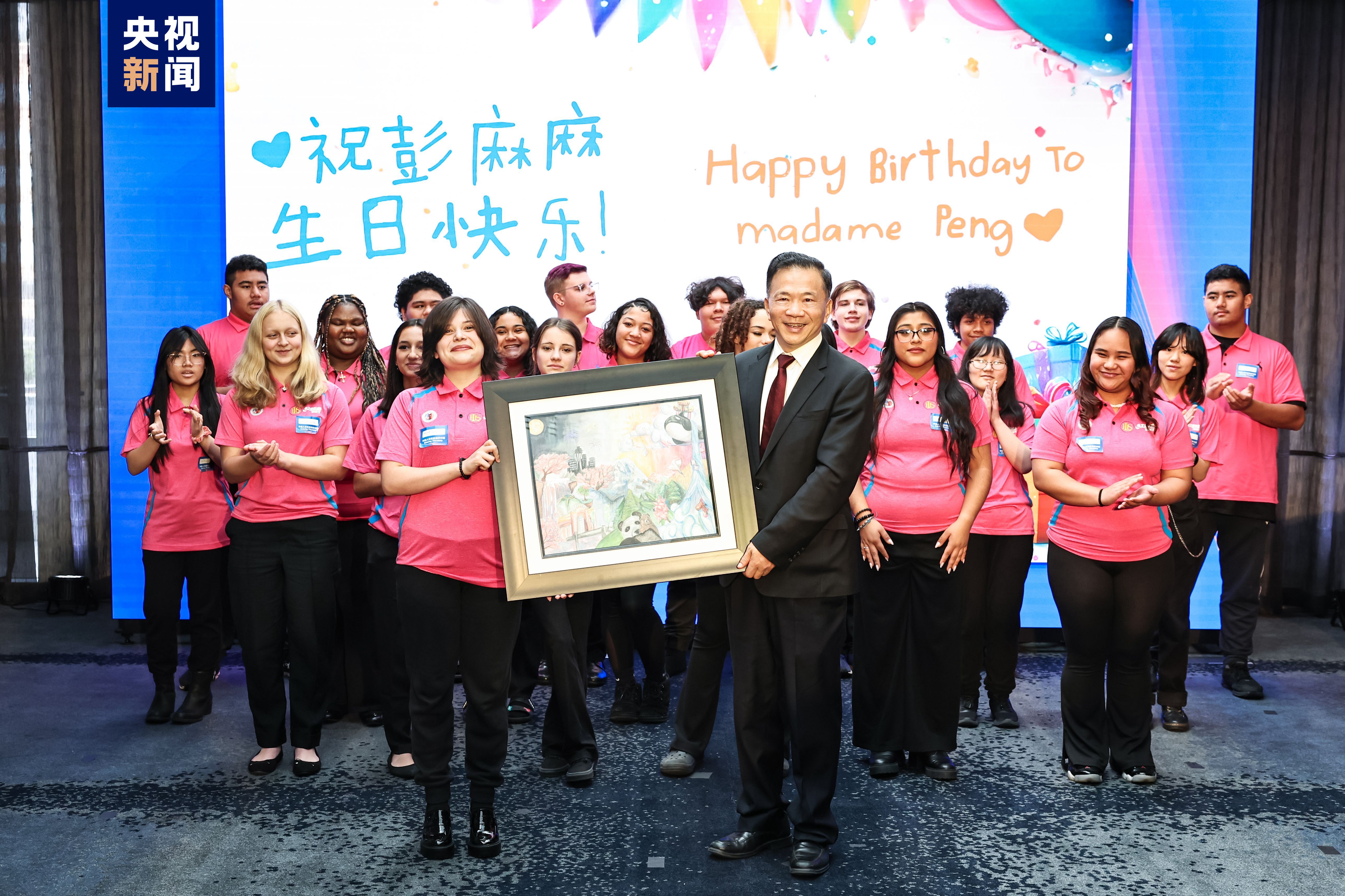 活动现场,来自华盛顿州林肯中学的合唱团演唱了中文歌曲《在希望的田野上》和英文歌曲《伴我同行》,祝愿中美友谊的纽带更加牢固,焕发新的活力。同学们还为习近平主席和夫人彭丽媛精心准备了手绘画作《一起向未来》,并用精美的生日贺卡和《生日快乐》歌亲切地为“彭麻麻”送上了生日祝福。总台台长代为接收。