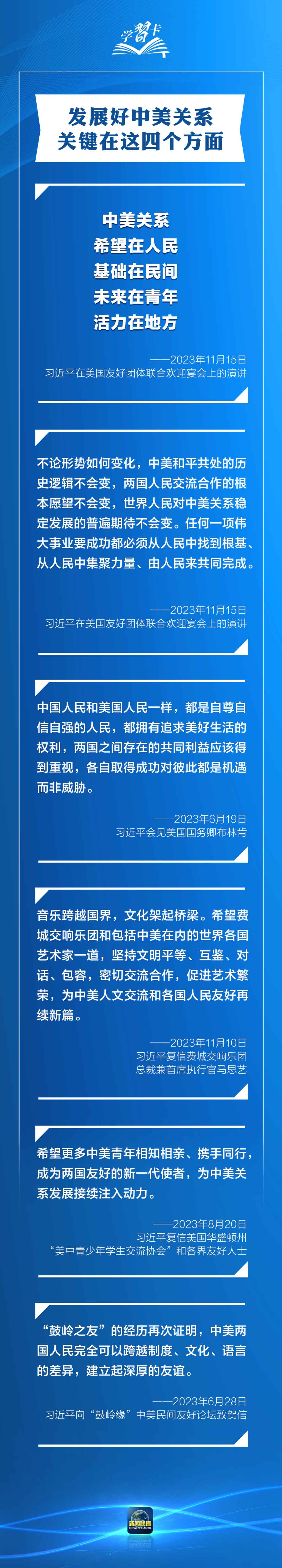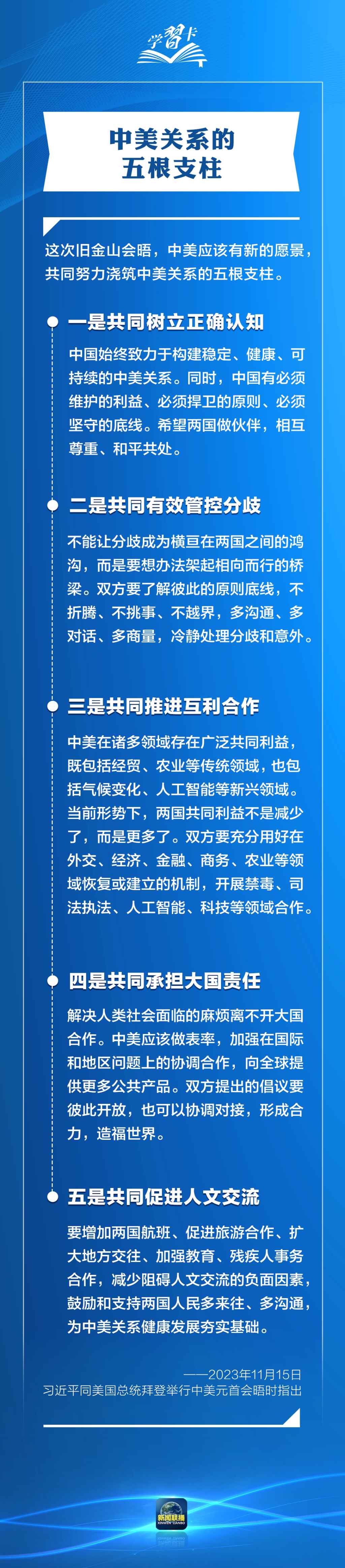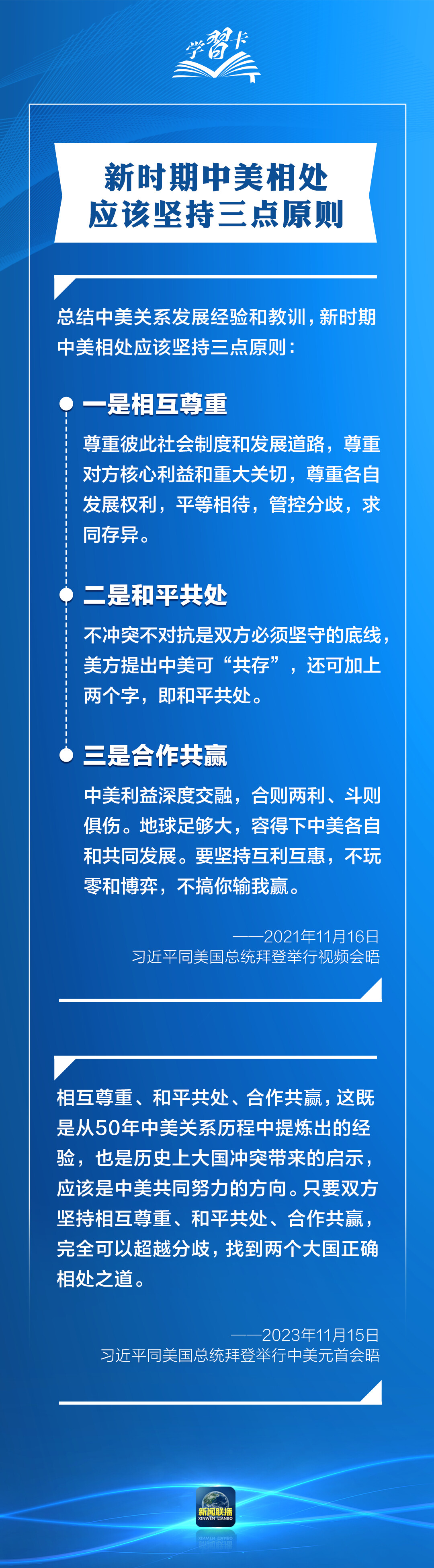 习近平多次指出,作为两个世界大国,中美能否确立正确相处之道,攸关世界和平发展和人类前途命运。发展中美关系,习主席强调三点原则、四个方面、五根支柱,一起学习→