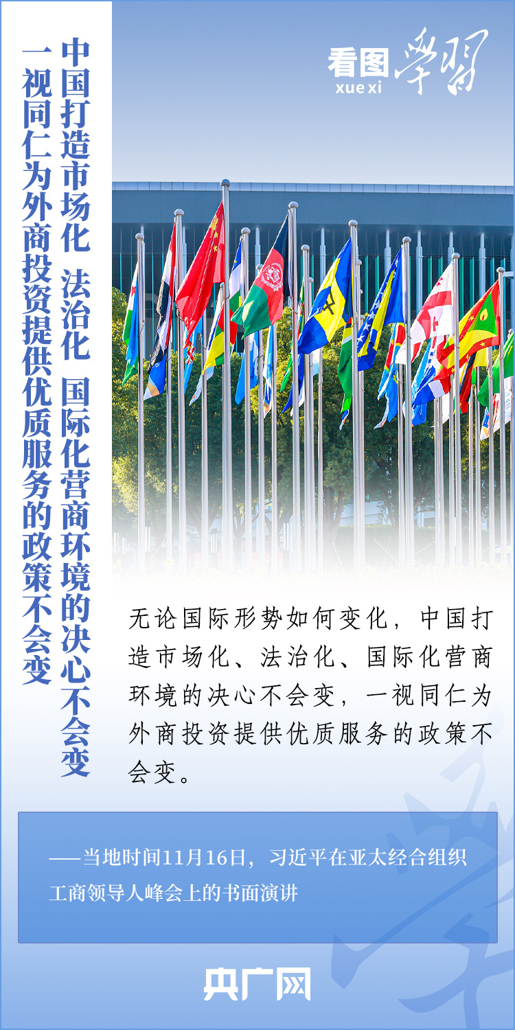 当地时间11月16日,国家主席习近平应邀出席亚太经合组织工商领导人峰会并发表书面演讲。习主席深刻总结了亚太经济合作30年来非凡成就和启示,对亚太合作下一个30年将走向何方这一新的时代之问提出中国答案,重申“中国打造市场化、法治化、国际化营商环境的决心不会变,一视同仁为外商投资提供优质服务的政策不会变”,向全球工商界发出邀请,欢迎“积极参与中国式现代化进程,共享中国高质量发展带来的巨大机遇!”一起来学习。
