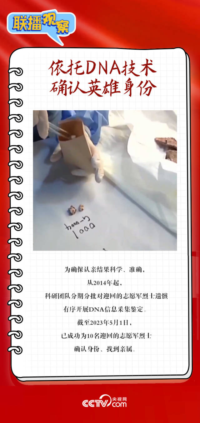 祖国没有忘记,人民没有忘记。自2014年起,我国连续9年以最高礼遇迎接在韩志愿军烈士遗骸回国。近年来,国家有关部门协调多个单位推动展开志愿军烈士遗物鉴定和DNA信息采集,为无名英雄开展寻亲活动,帮助更多英烈从无名到有名,从回国到“回家”。