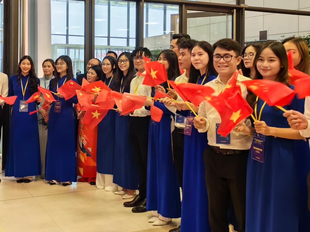 中越友好人士及青年见面会现场气氛热烈,鲜花和两国党旗国旗交相辉映,汇成一片喜悦的海洋。