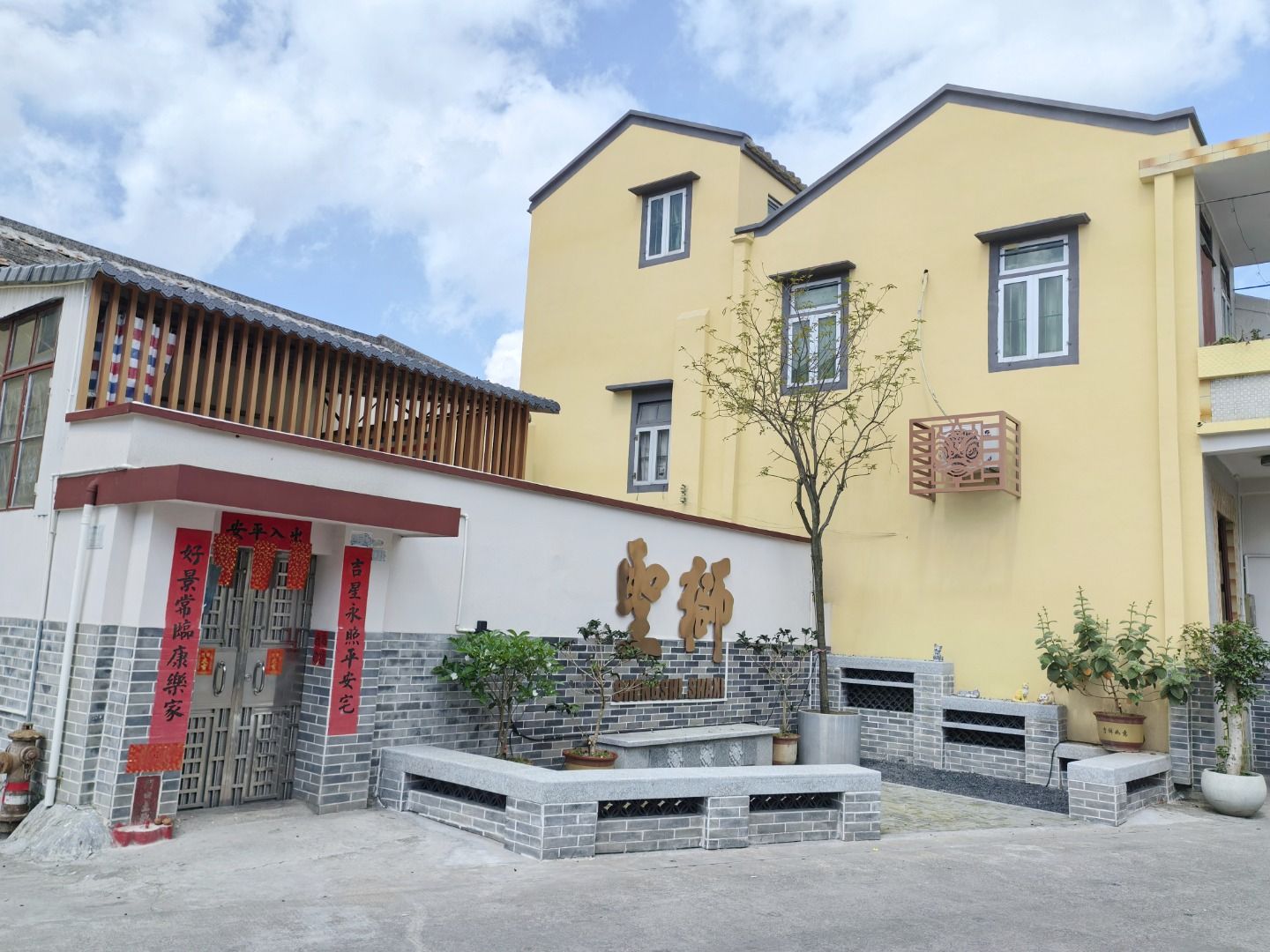 改造后的农房融合传统与现代风格,墙面“圣狮”标识格外吸睛,门口“四小园”景观整洁雅致,尽显乡村焕新风貌。
