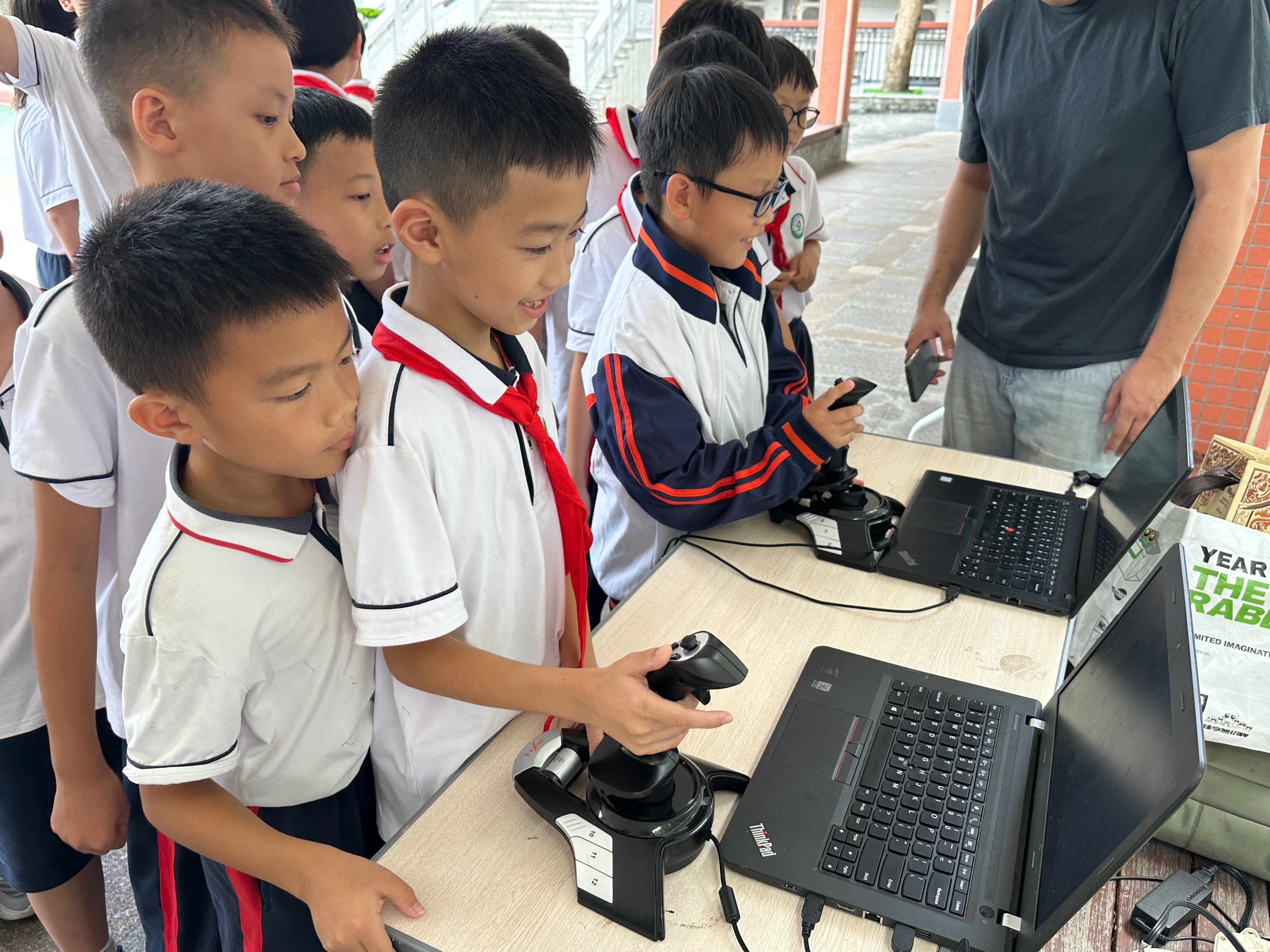 开幕式结束后,校园变身“科技大观园”,一个个互动摊位吸引着学生们流连忘返。在机器狗体验区,“电子宠物”摇头摆尾、灵活翻滚,引得孩子们争相互动。“模拟飞行”摊位前,同学们手握操纵杆完成起飞、巡航、降落全流程,仿佛化身小飞行员,沉浸式体验让同学们直呼“过瘾”。