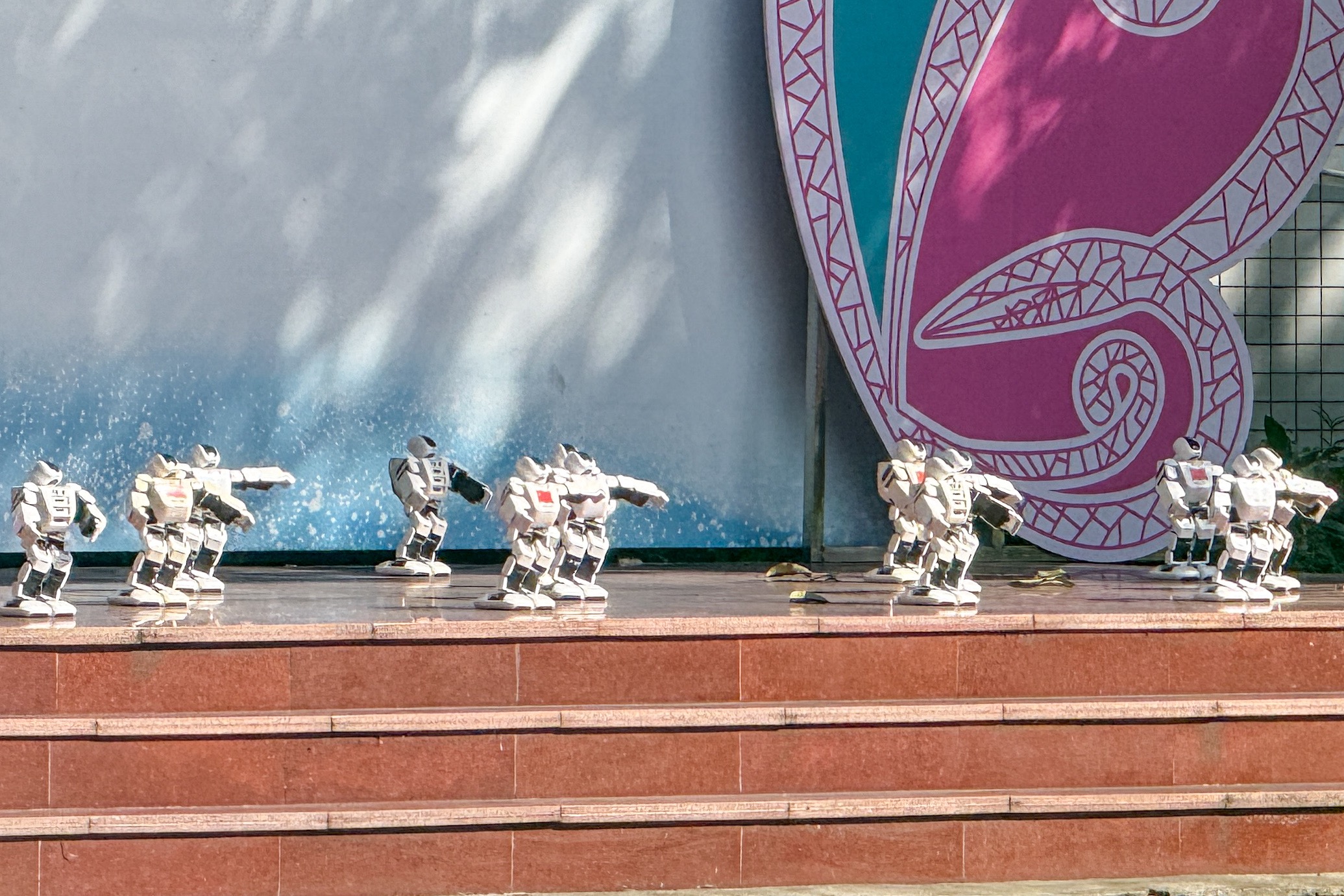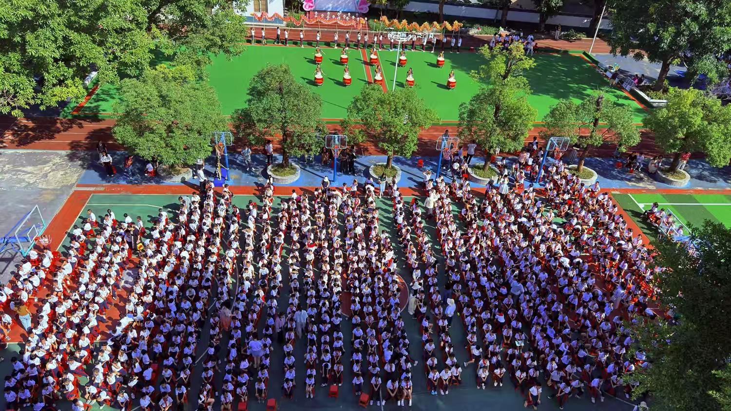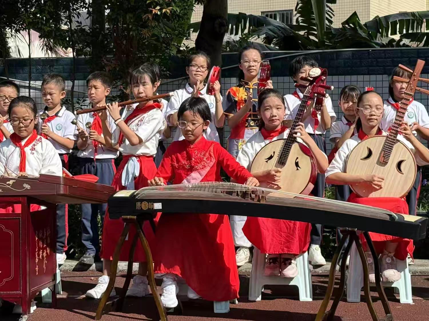 伴随着龙腾鼓韵的激昂鼓点,科技节正式拉开帷幕。庄严的升旗仪式后,五星红旗在校园上空迎风飘扬,现场师生肃立致敬。随后,一场别出心裁的表演点燃全场——学校民乐队奏响悠扬旋律,与智能机器人默契配合演绎《我和我的祖国》,传统民乐与科技元素的碰撞,让现场掌声不断。