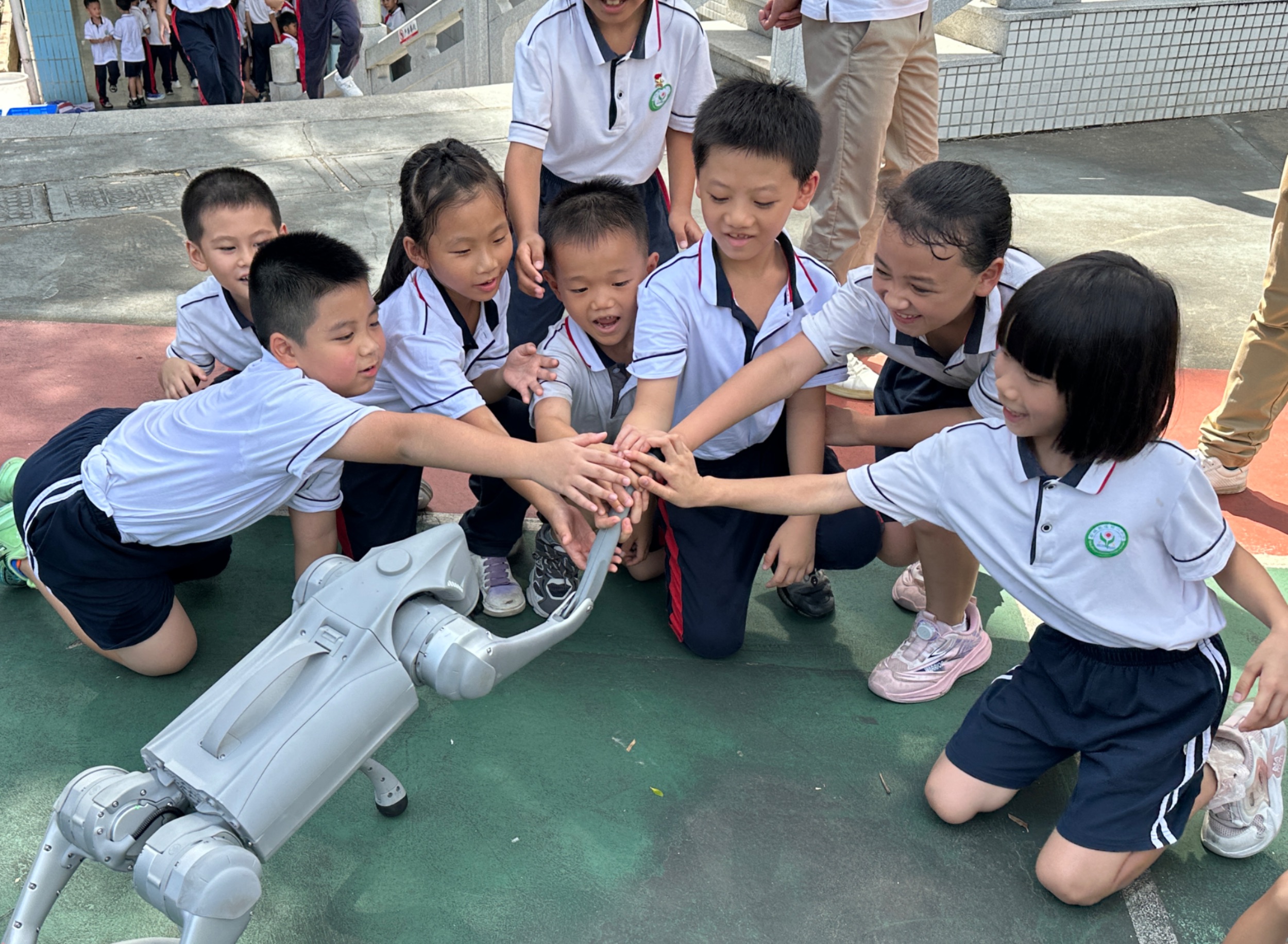 9月29日上午,石岐张溪郑二小学的操场上热闹非凡:机器狗迈着灵活步伐与孩子们互动嬉戏,模拟飞行设备前传来阵阵惊叹,无人机在空中盘旋俯冲引得学生们欢呼雀跃。