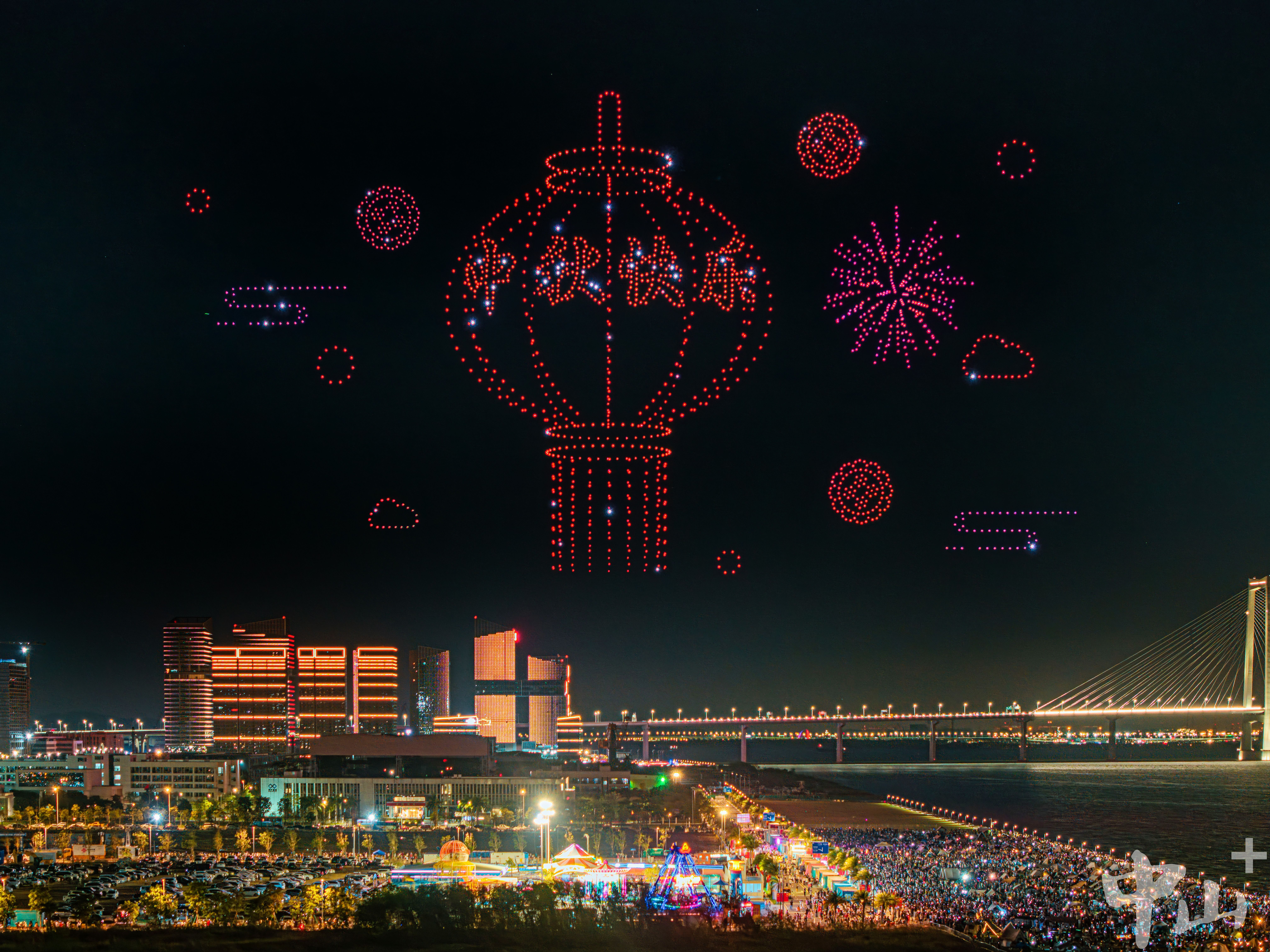 国庆中秋双节夜幕下,翠亨新区马鞍岛上空,2000架无人机与深中通道同框绽放,以“千机绘新卷,万象聚香山”为主题打造光影盛宴。