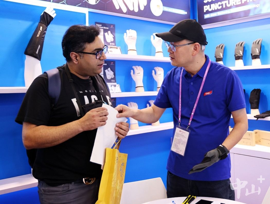 太力科技的展位,一款看似普通的防刺防割手套引发阵阵惊呼。工作人员现场演示美工刀切割和针头穿刺,手套均毫发无伤,其采用的柔性纳米流体技术让围观客商连连称奇。“这太不可思议了!”一位中东采购商惊叹道。