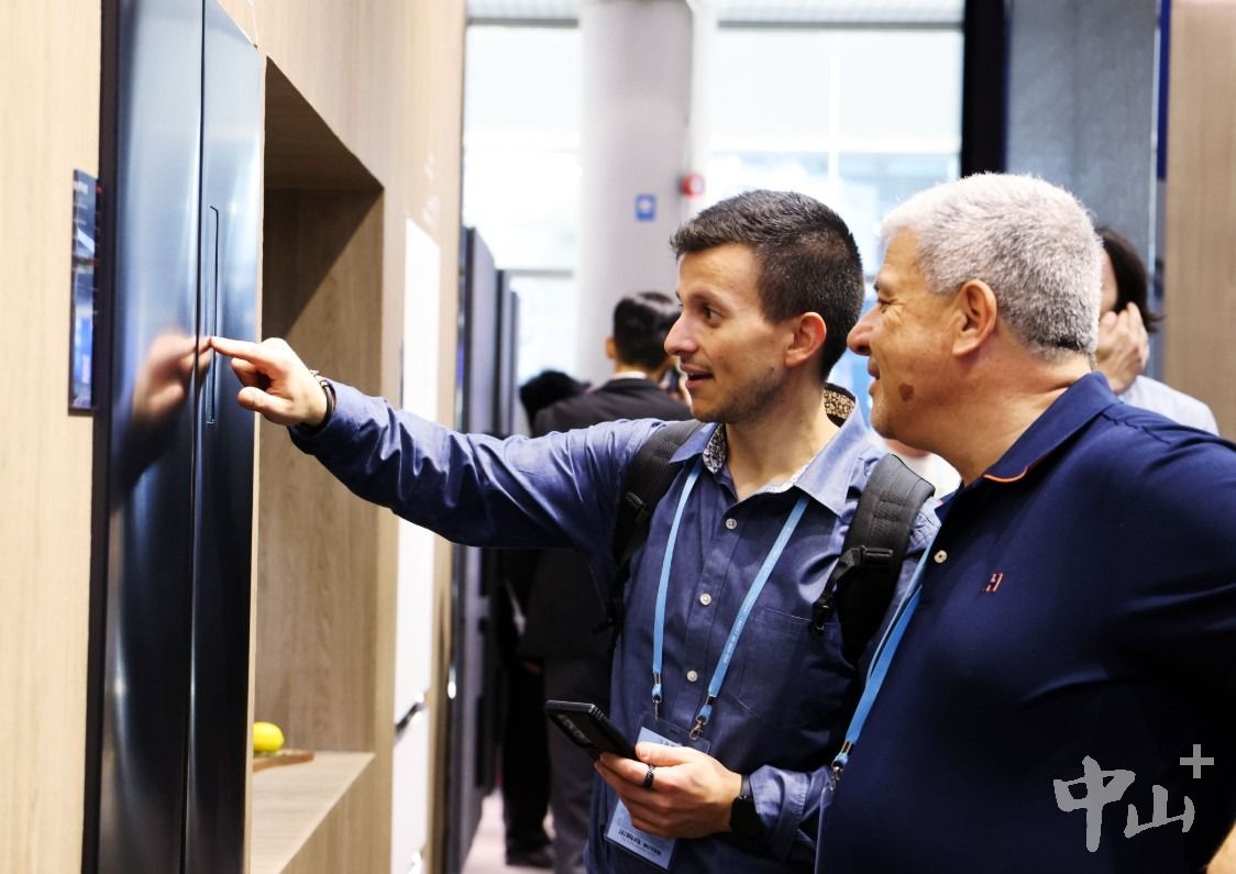 当天,记者在参展现场看到,展馆内外人流如织,前来采购的海外客商络绎不绝。中山华帝、威力集团、樱雪集团等中山参展企业的展位前人头攒动,洽谈正酣,不少境外采购商口中不断发出“Amazing”(神奇)和“Interesting”(有趣)的赞叹声。每个中山企业的展位上,统一张贴着“广东优品,中山智造”橙色品牌标识,持续提升中山制造在全球产业链中的辨识度。