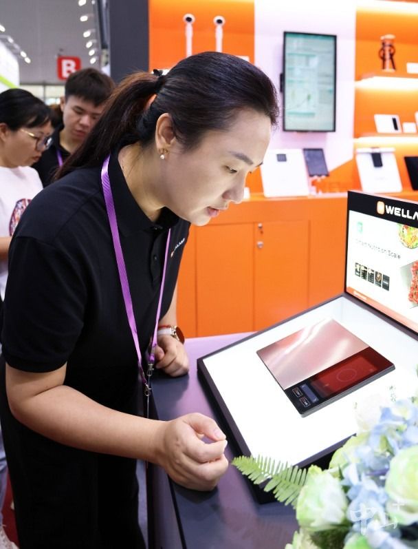 沃莱科技的智能健康产品前也围满了人。销售总监黄文妤正向客商演示一款AI智能语音厨房营养秤:“它不仅能精准称重,还能通过语音识别分析食物营养成分,帮助用户科学管理膳食。”据悉,该产品在亚马逊平台已热销40万台。